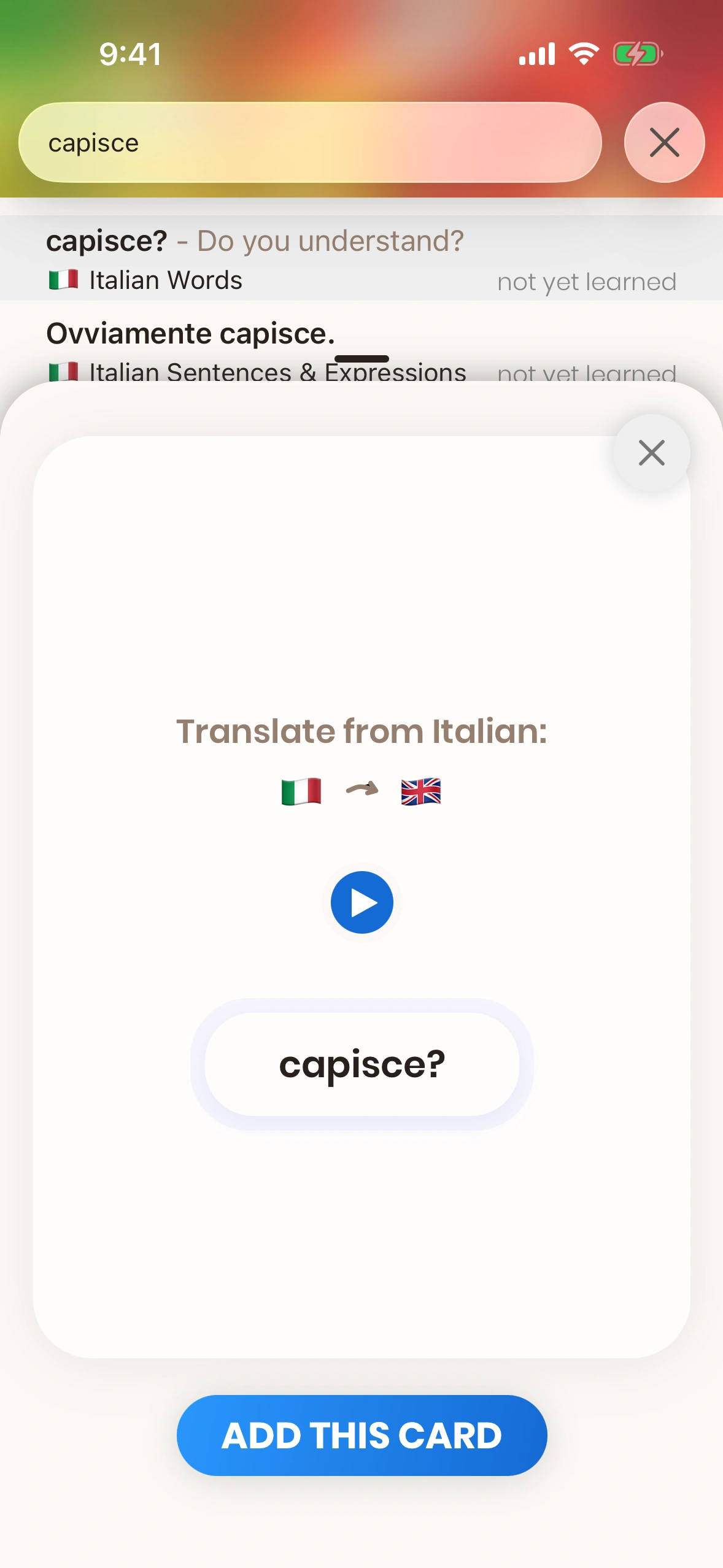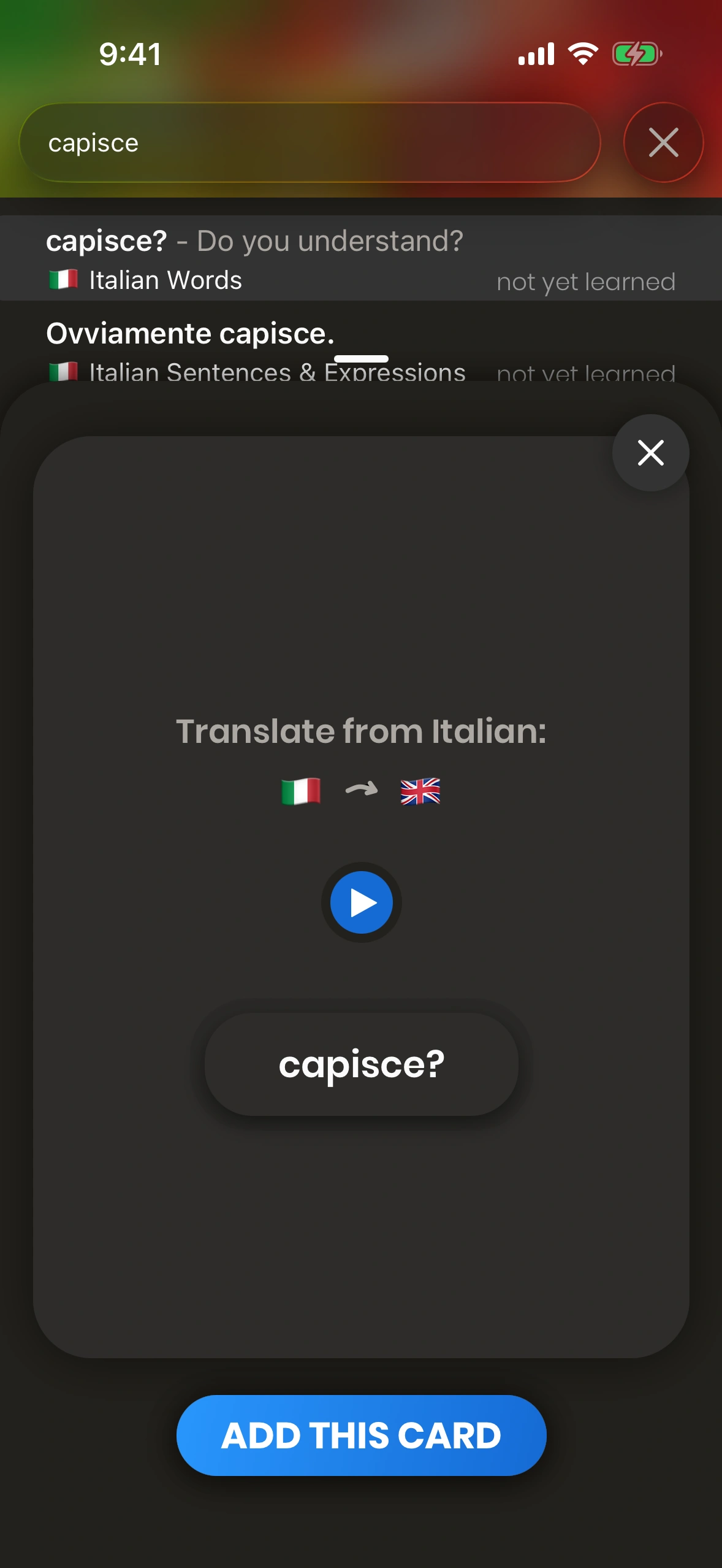 Just Italian lets you create your own cards too - but why not use the +30'000 high-quality cards that come with the app?