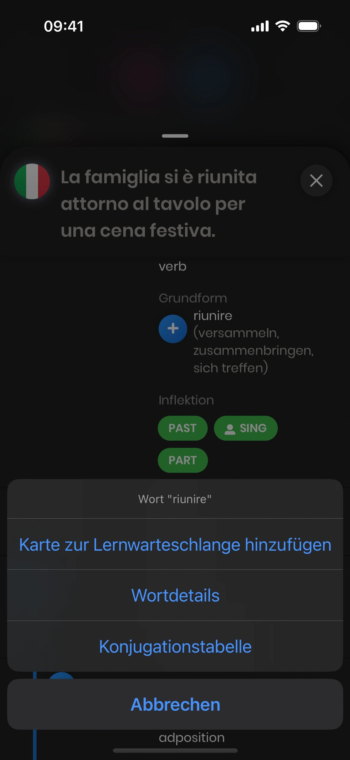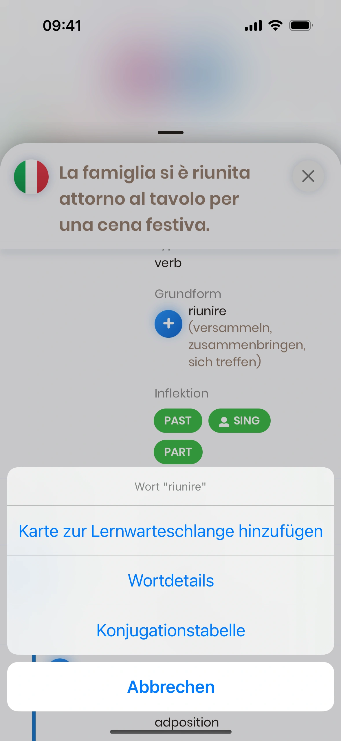 - Karte zur Lernwarteschlange hinzufügen: Fügt das ausgewählte Wort als eigene Karte deiner Lernwarteschlange hinzu.