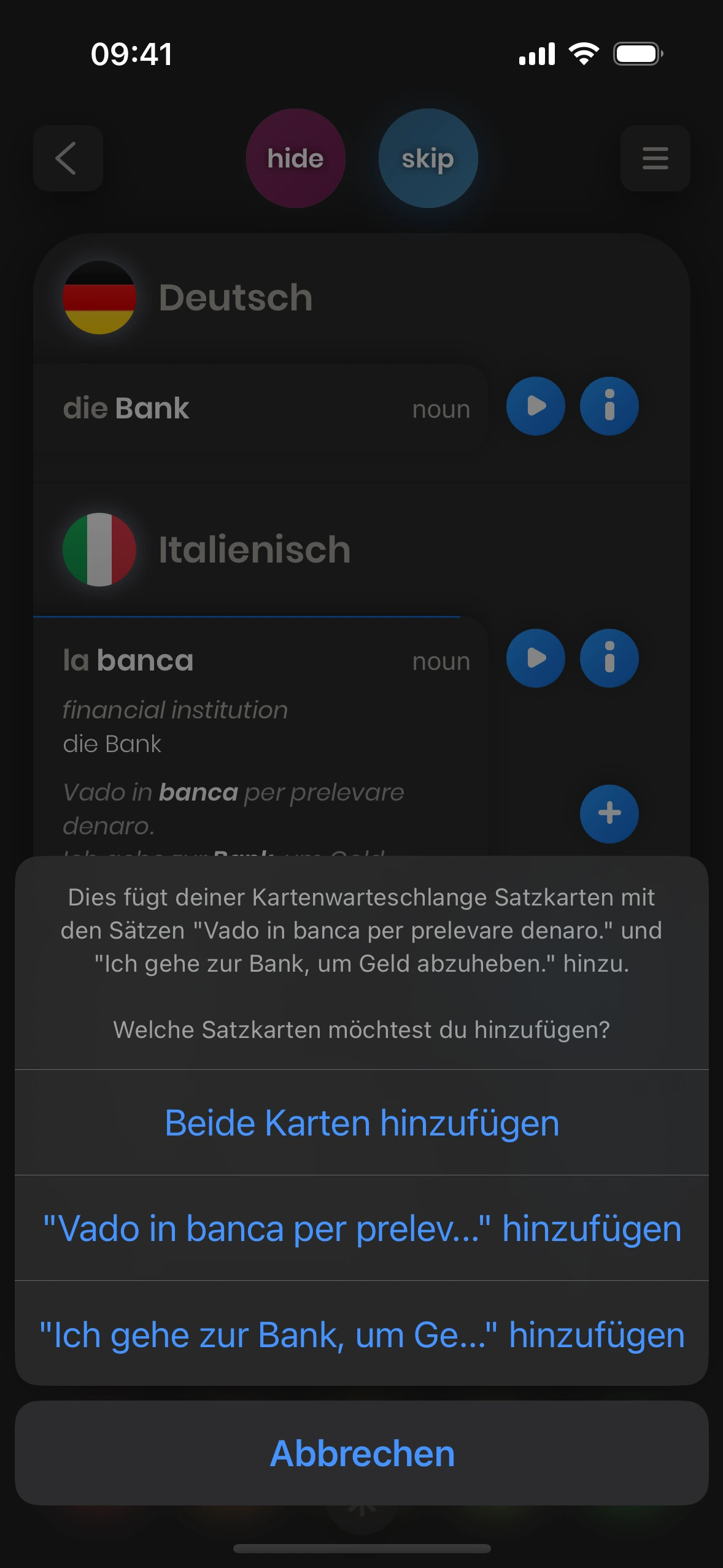 Wenn du auf einen Beispielsatz stößt, den du gezielt üben möchtest, kannst du ihn als eigene Lernkarte hinzufügen. Tippe dazu rechts neben dem Beispielsatz auf die (+)-Taste.