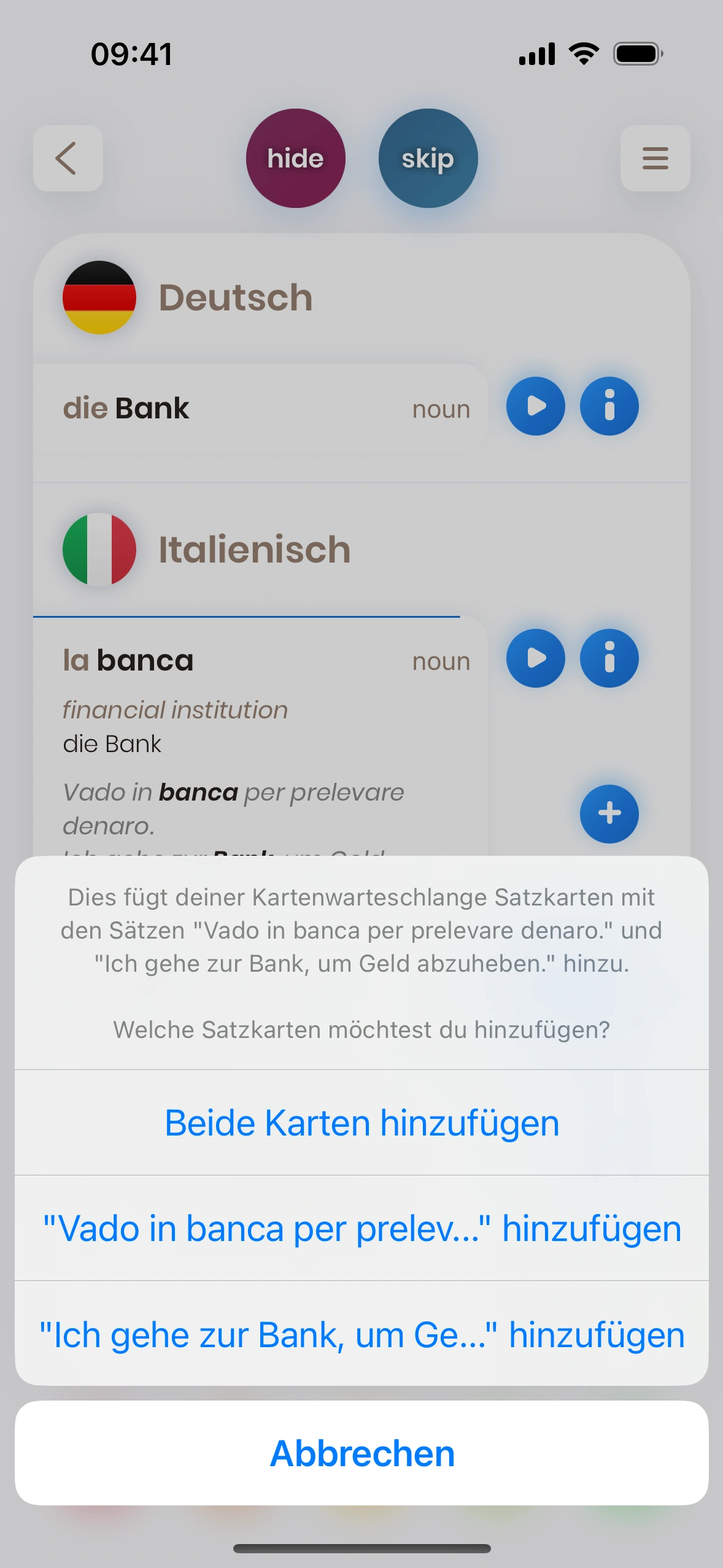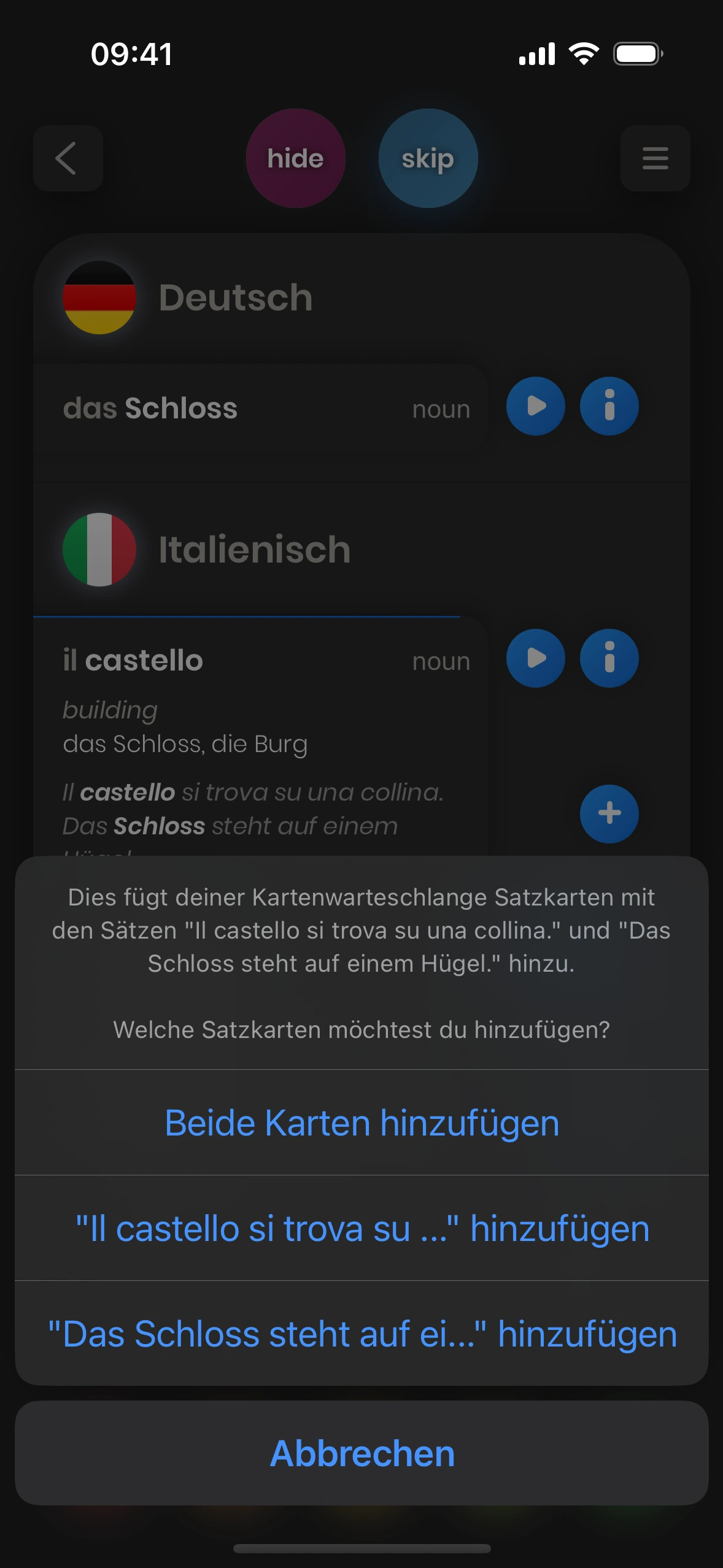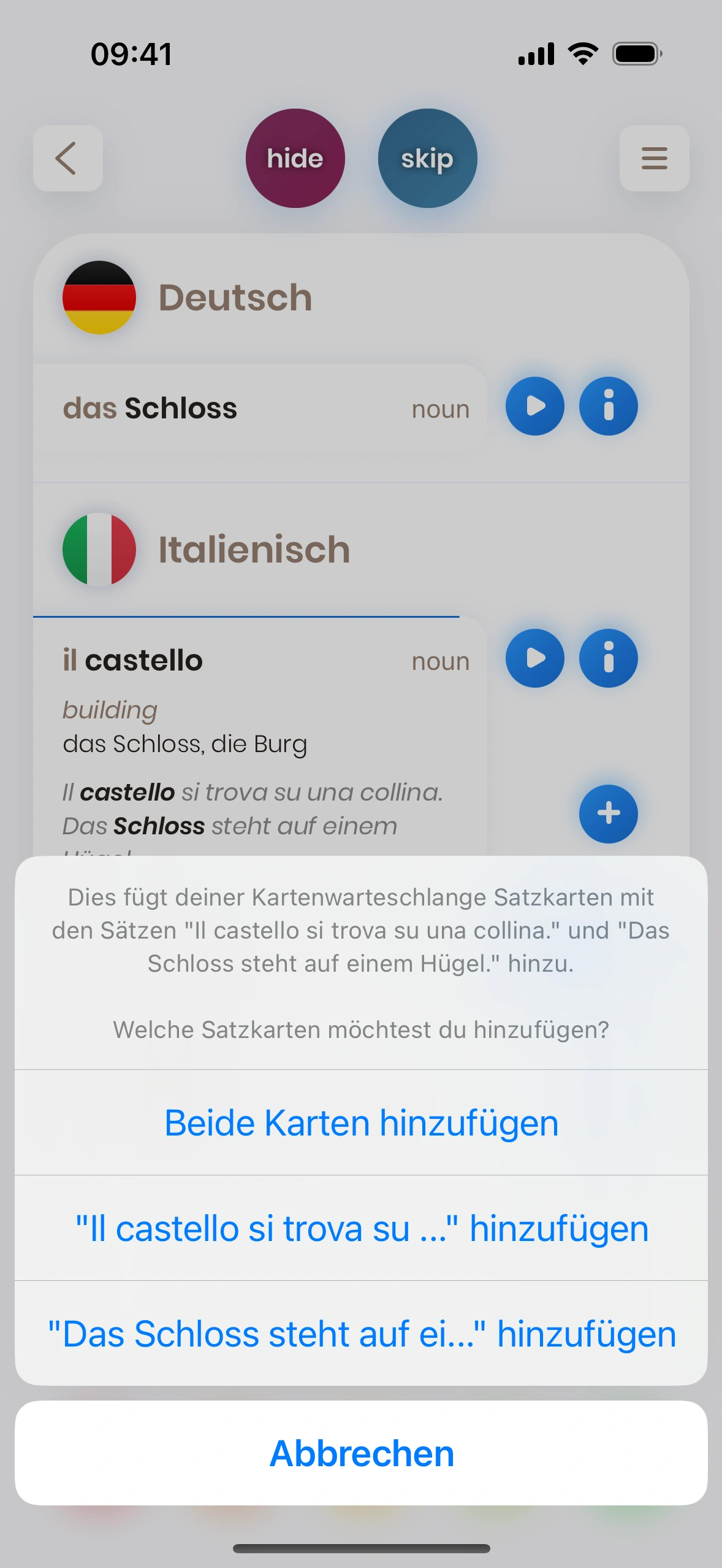 Die meisten Satzkarten bieten an, die einzelnen Wörter des Satzes hinzuzufügen.