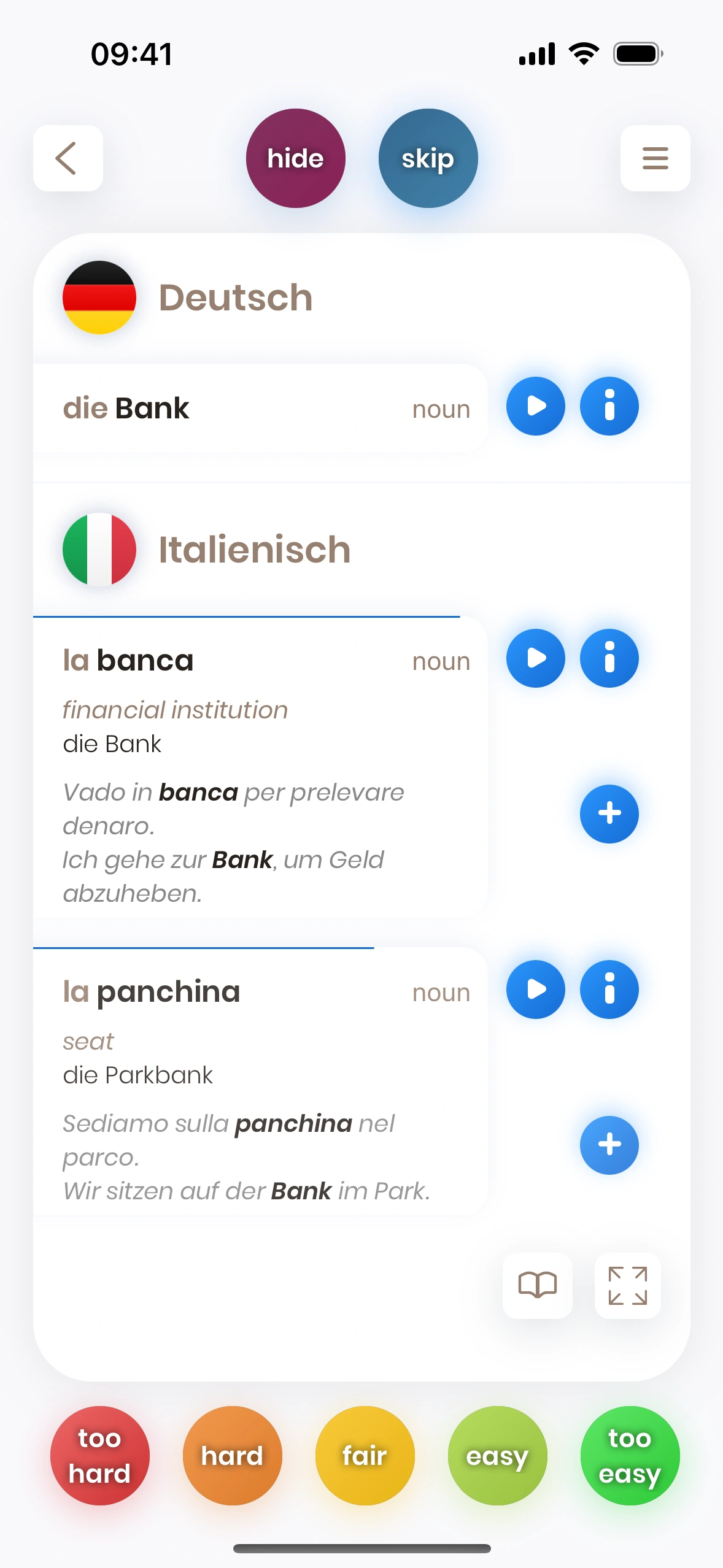Wenn du ein Wort in verschiedenen Kontexten übst (als Einzelwort und in Beispielsätzen), wirst du mit hoher Wahrscheinlichkeit nie wieder vergessen, wie du es übersetzt.