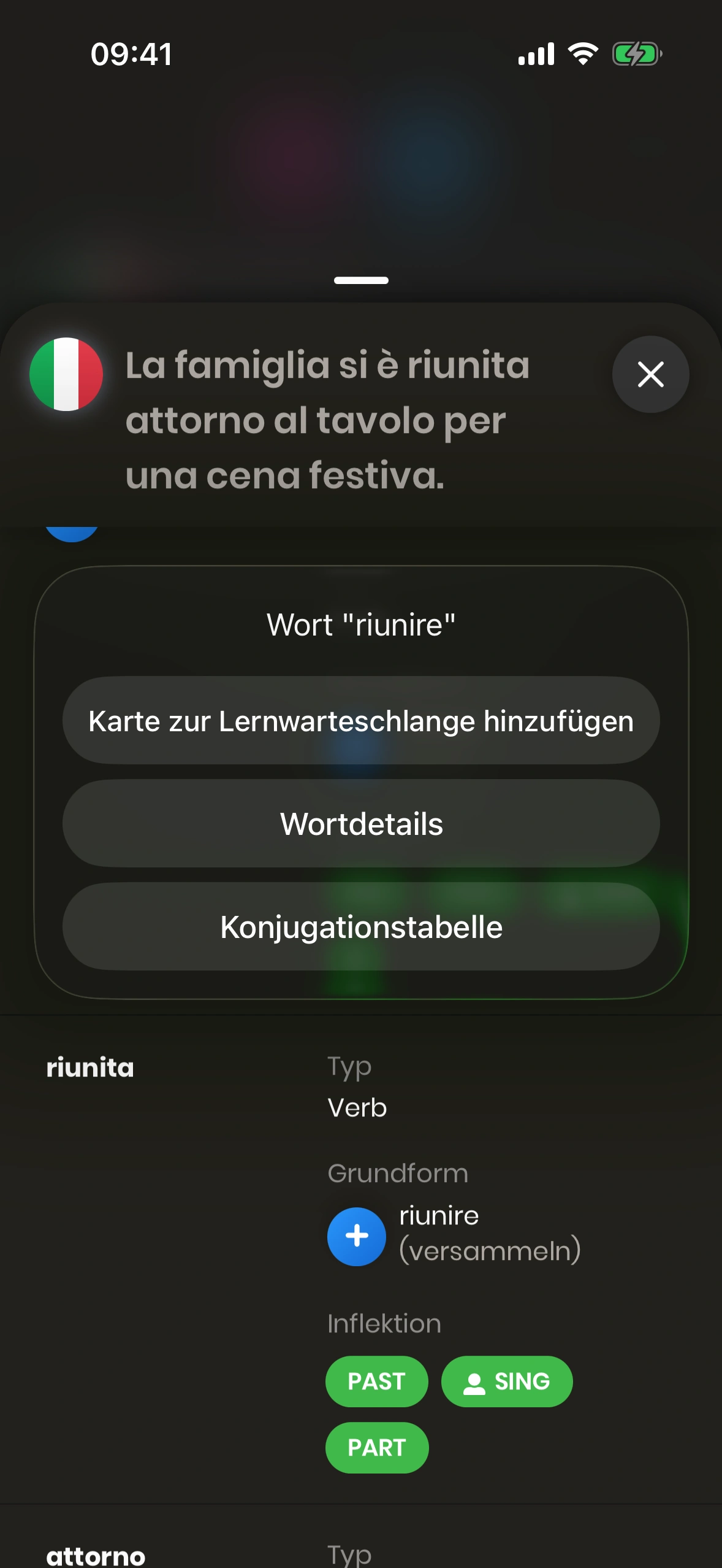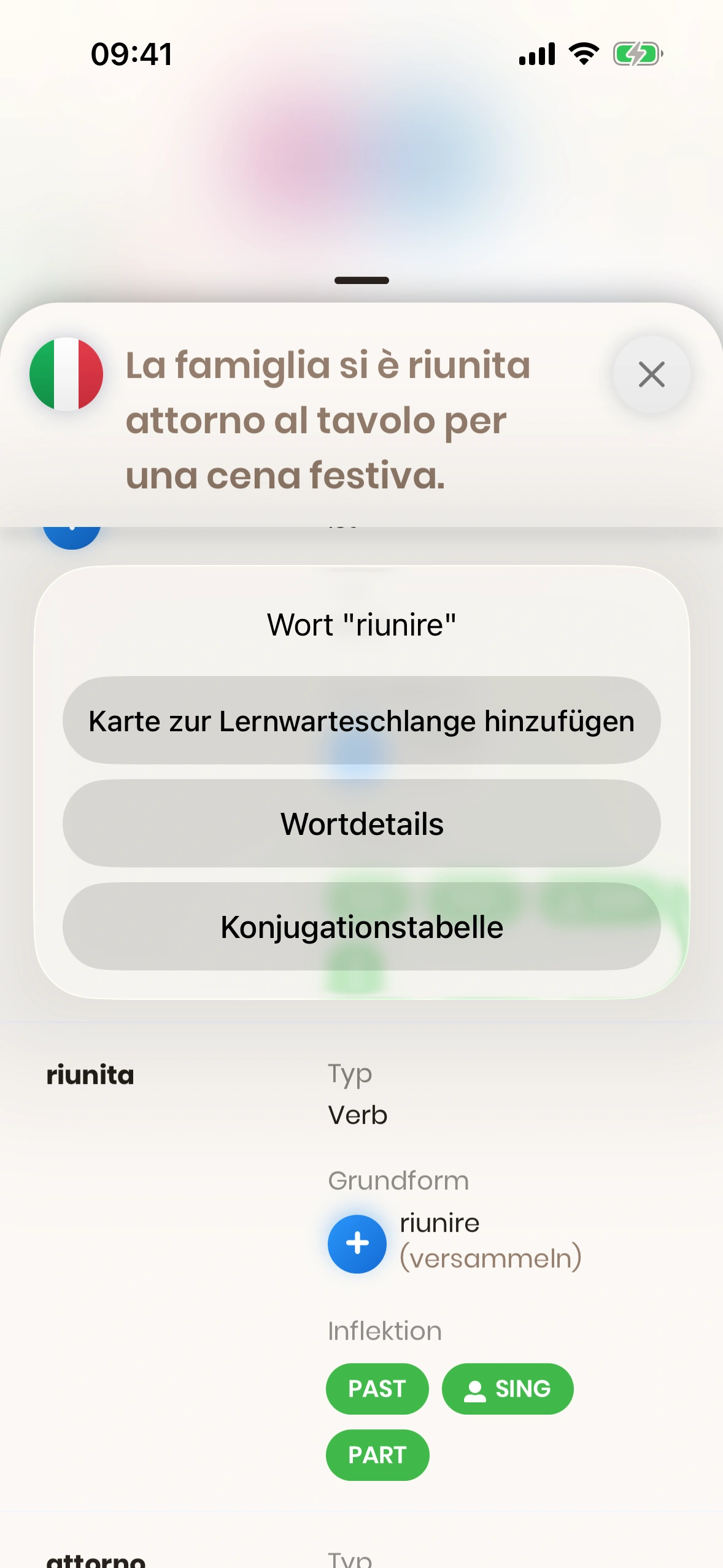 - Karte zur Lernwarteschlange hinzufügen: Fügt das ausgewählte Wort als eigene Karte deiner Lernwarteschlange hinzu.