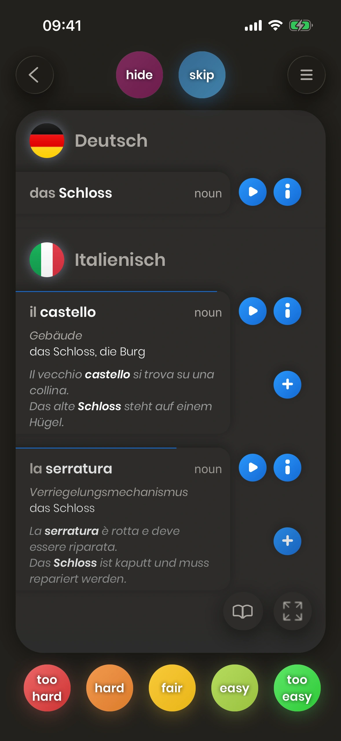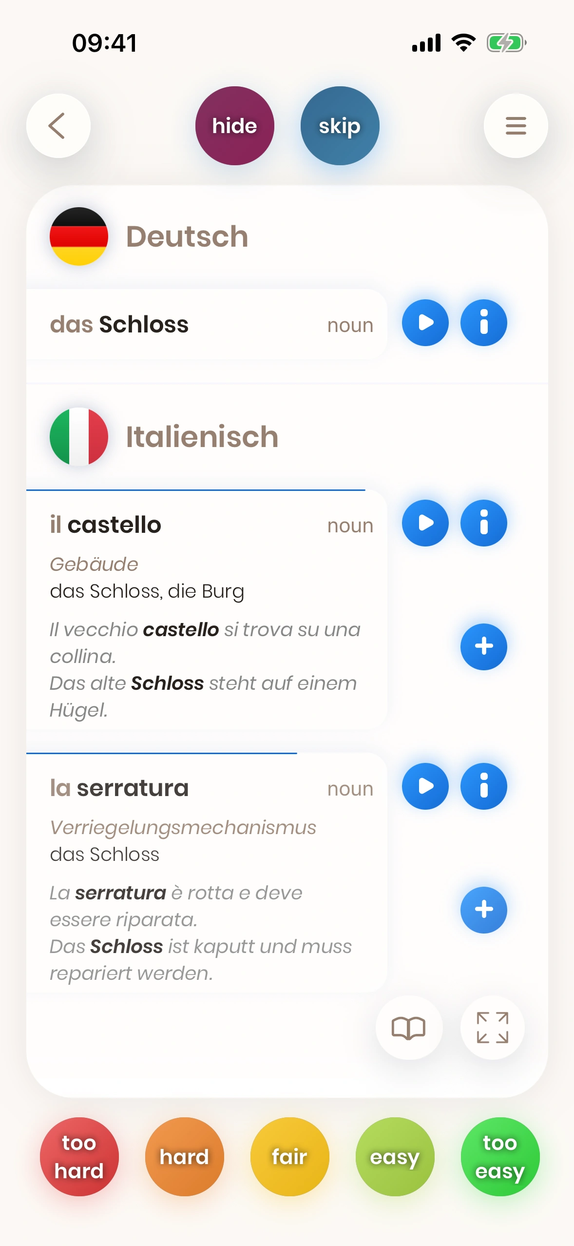 Wenn du ein Wort in verschiedenen Kontexten übst (als Einzelwort und in Beispielsätzen), wirst du mit hoher Wahrscheinlichkeit nie wieder vergessen, wie du es übersetzt.