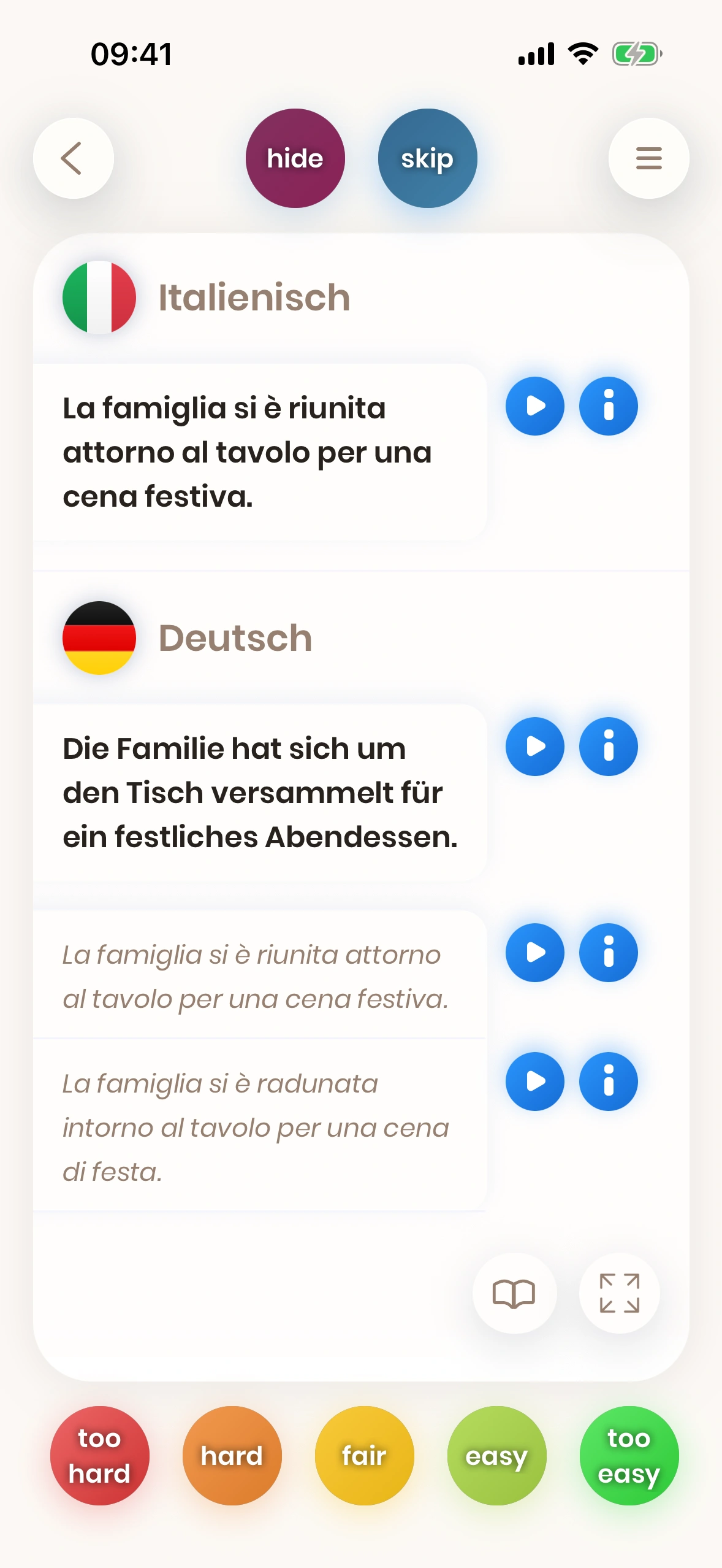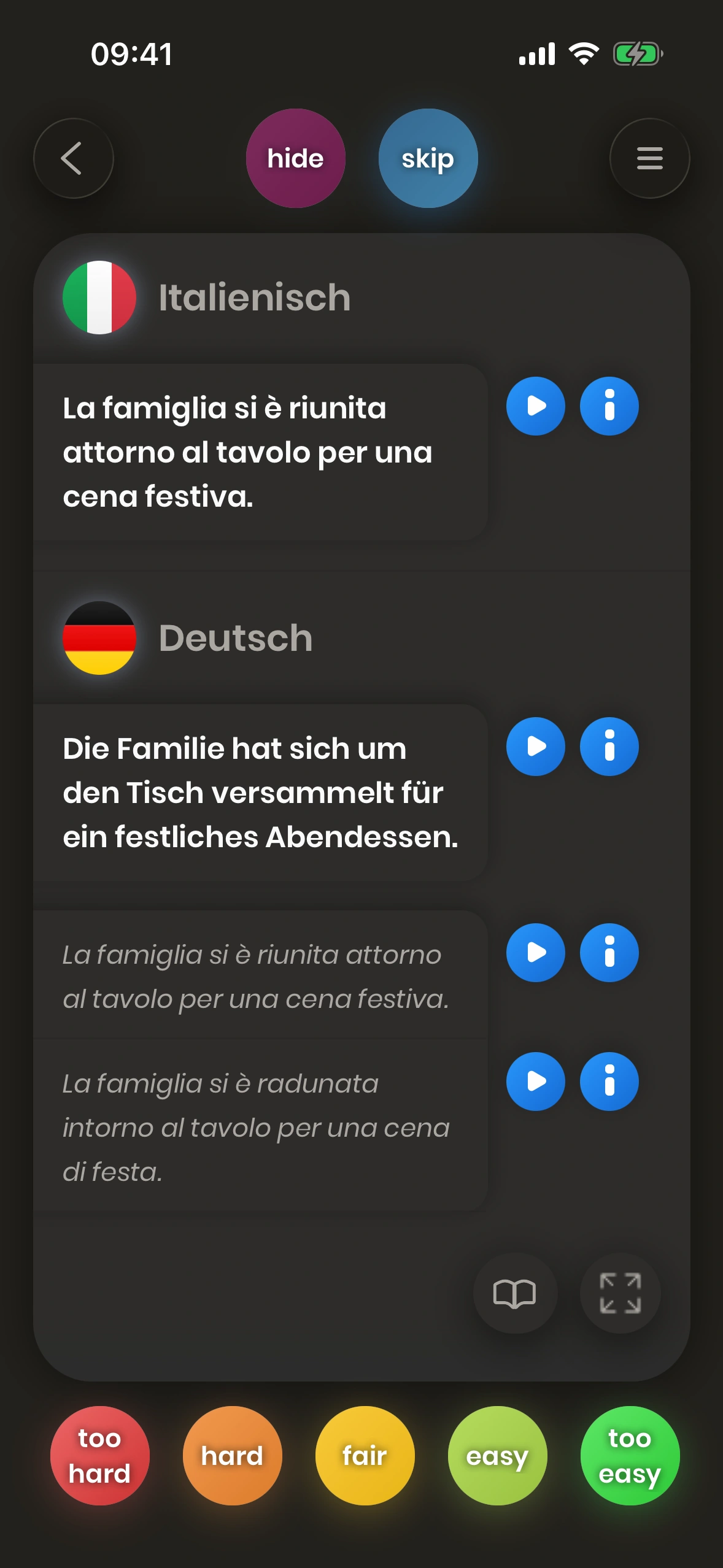Wie bei Wortkarten gibt es Richtungen: Deutsch‑zu‑Italienisch oder Italienisch‑zu‑Deutsch. Zu den meisten Satzkarten gibt es ein Gegenstück in der anderen Richtung.