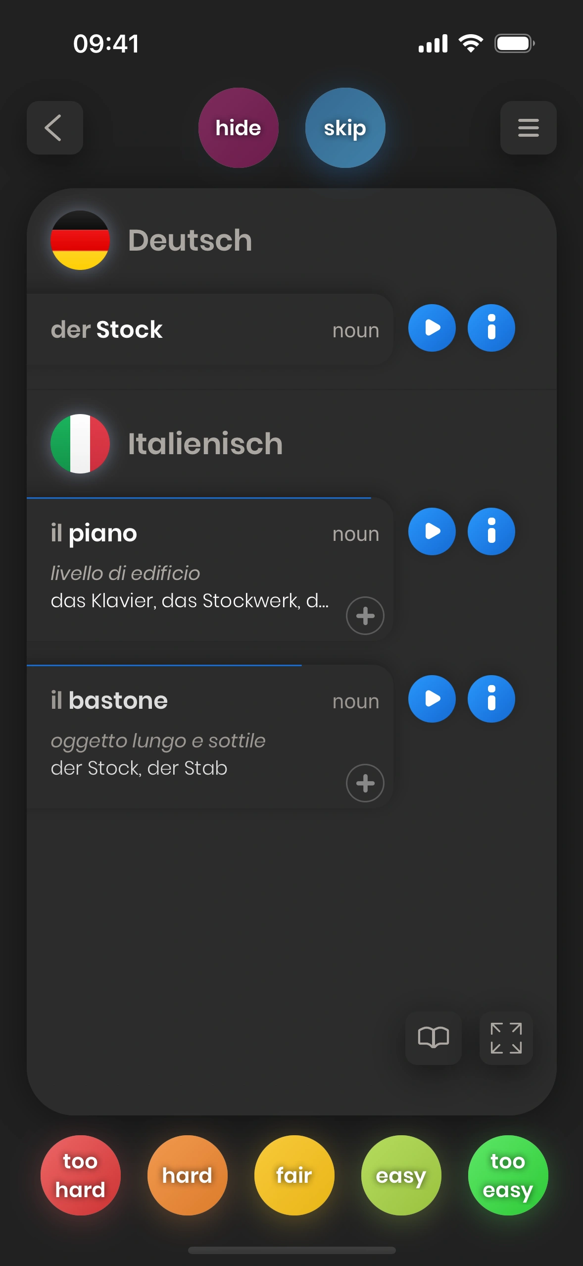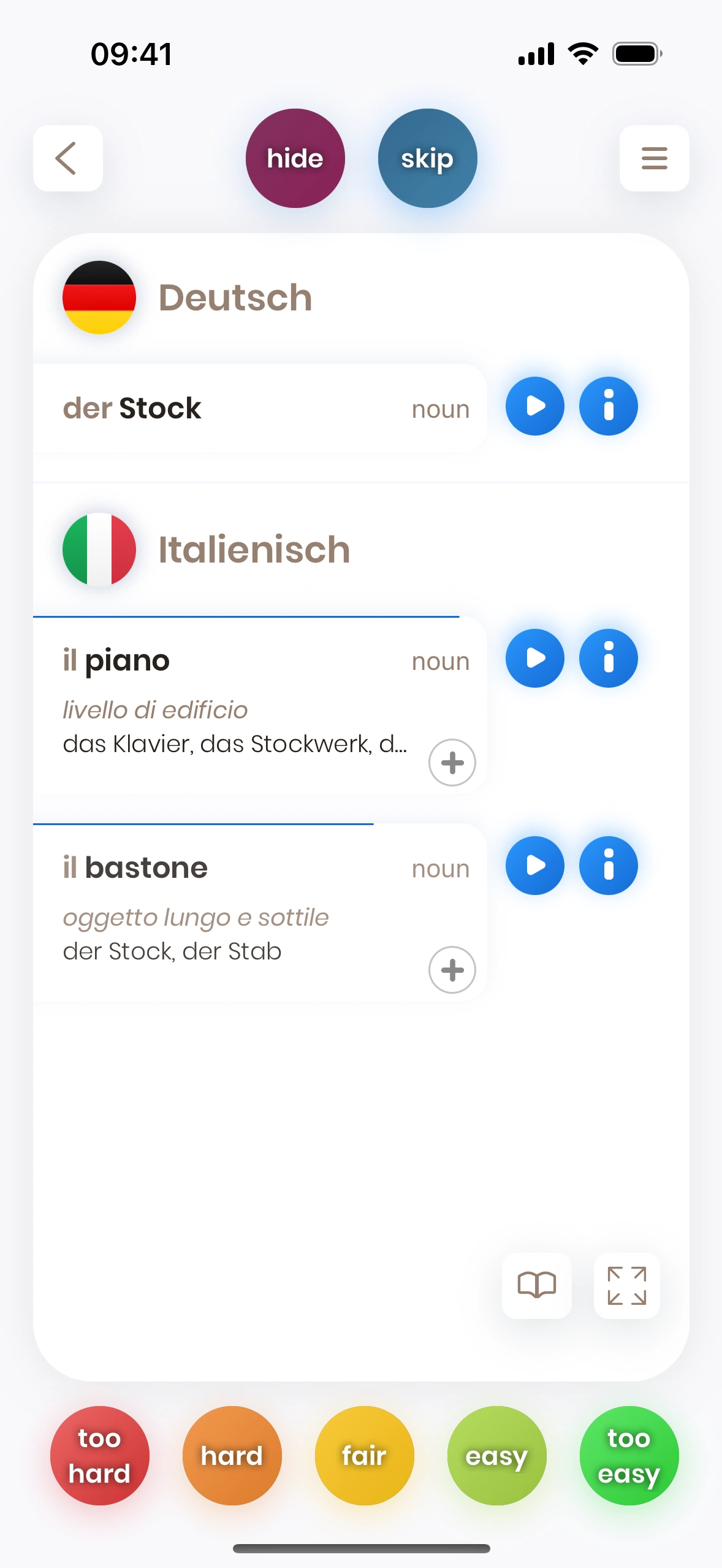 Diese Karten trainieren deinen passiven Wortschatz: Du verstehst italienische Wörter, nutzt sie aber vielleicht noch nicht aktiv.