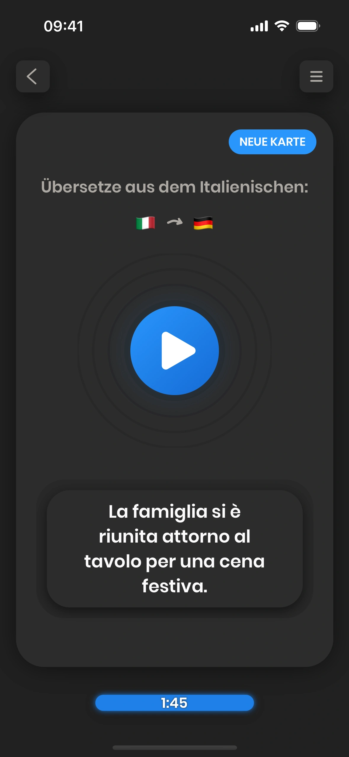 Just Italian ist für schnelles Lernen optimiert. Nimm dir gern Zeit, aber am effizientesten ist es, die Karten zügig durchzugehen. Mehr dazu hier.