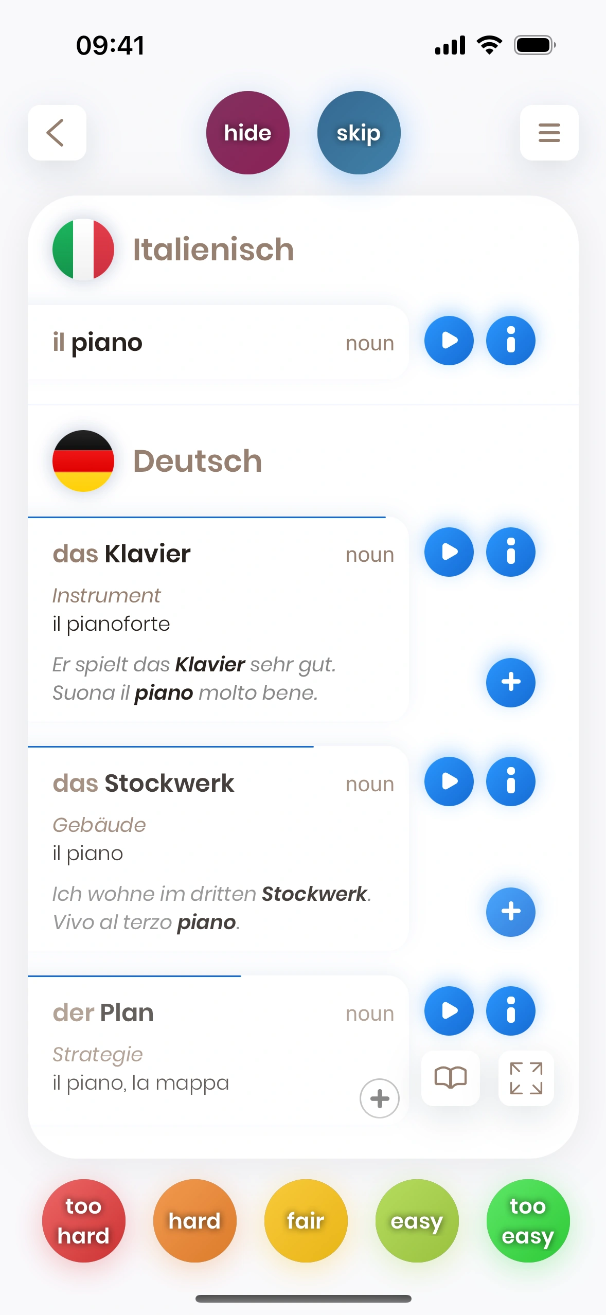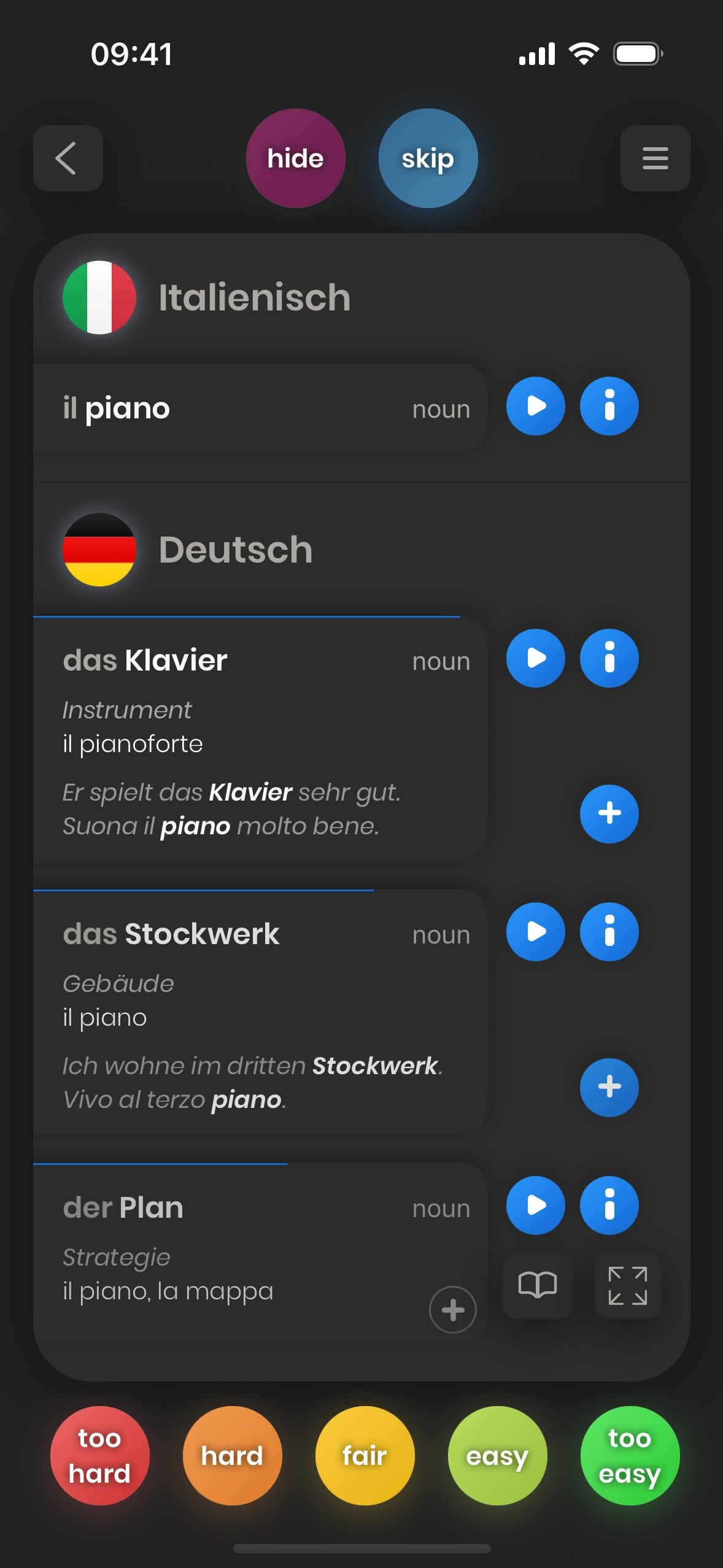 - Beispiel einblenden: Ist der Beispielsatz noch verborgen, blende ihn mit dem grauen (+) ein.