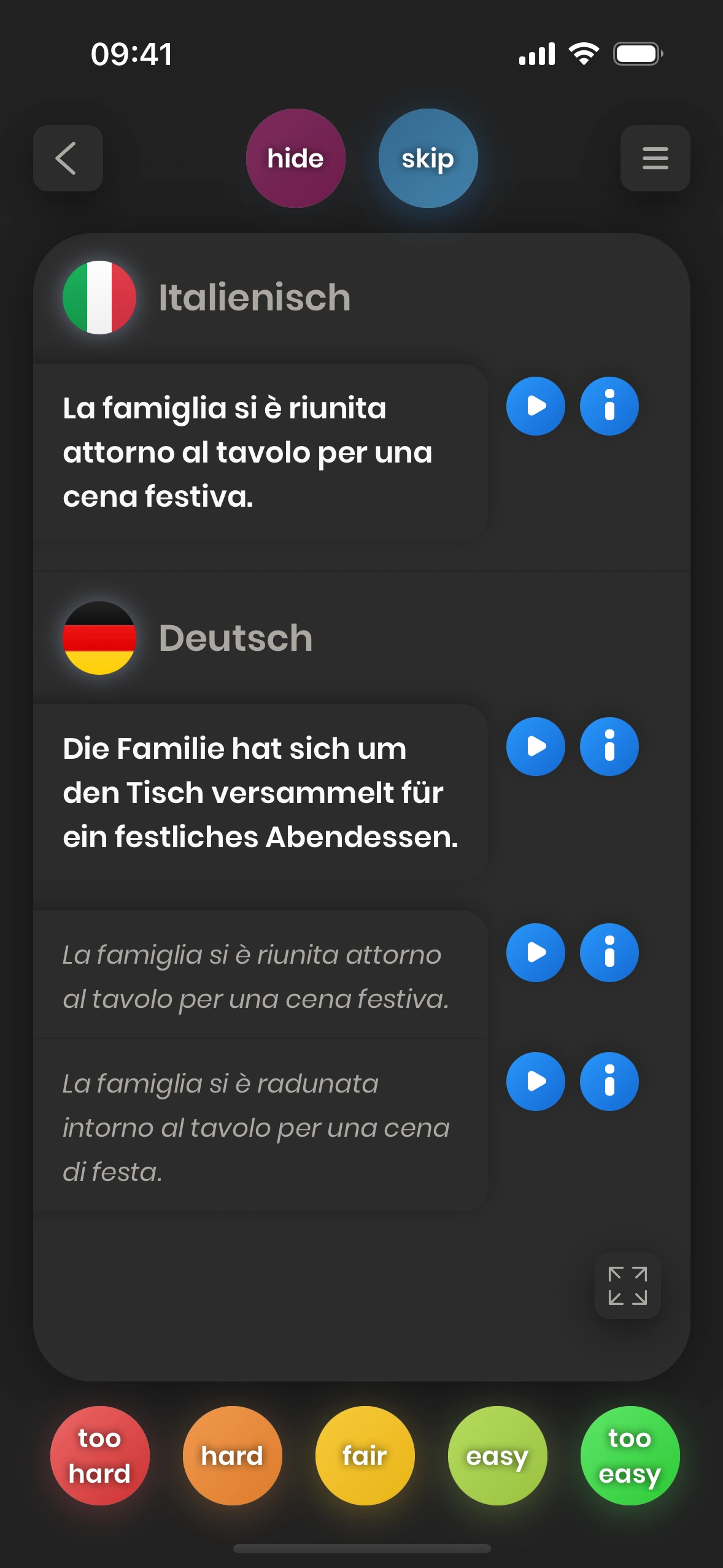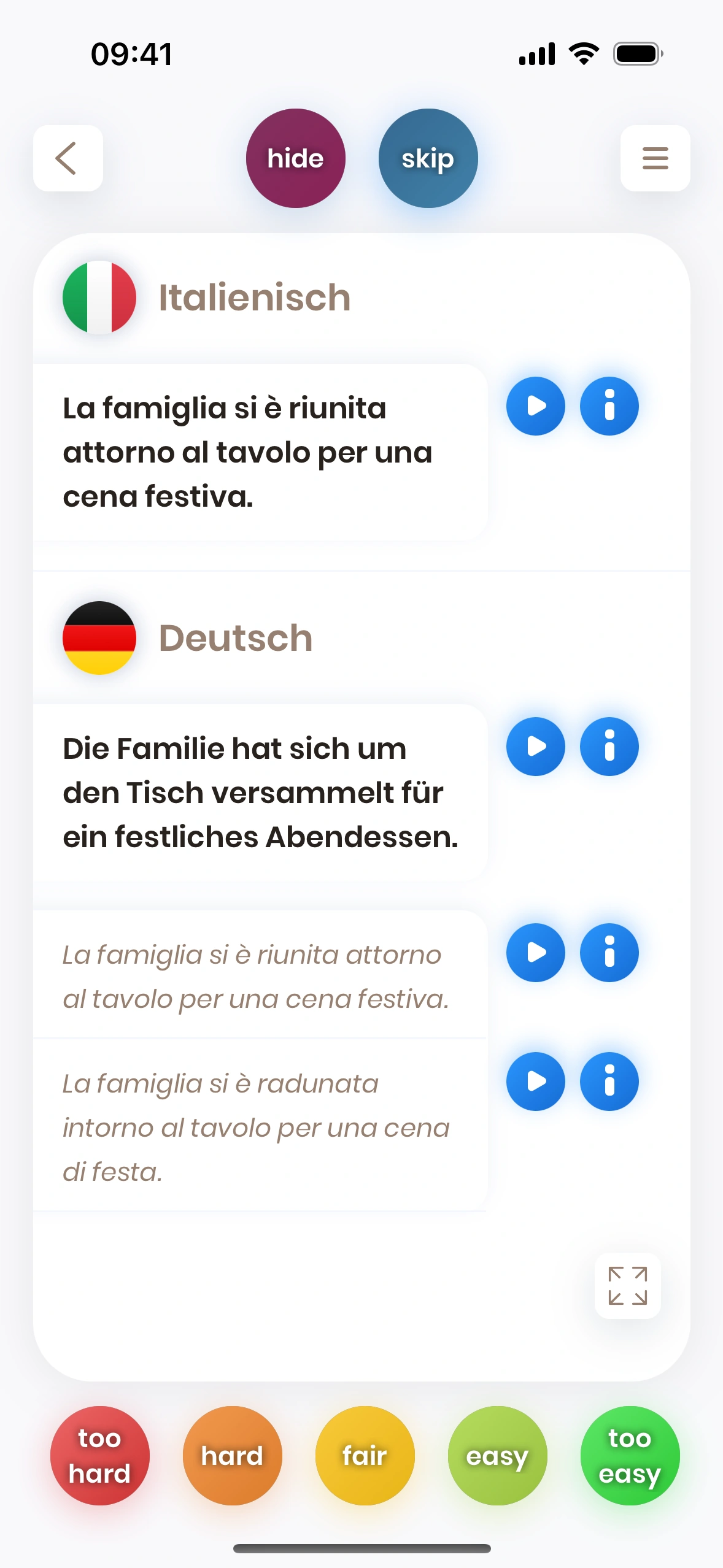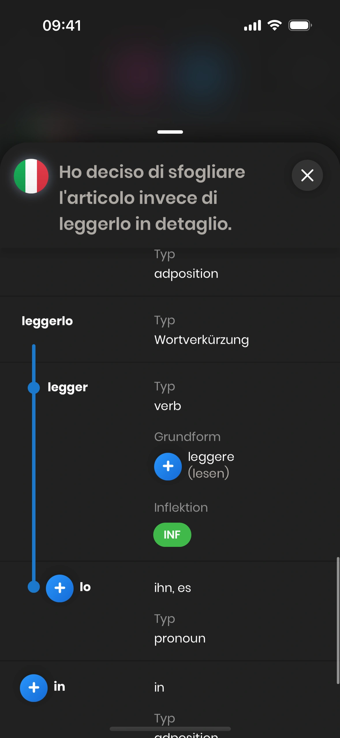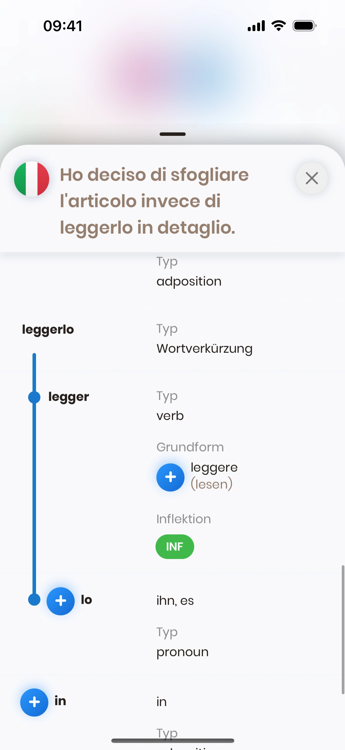 Der Satzstruktur‑Dialog erscheint, wenn du bei einer Satzkarte auf das (i) tippst – neben dem Satz in der Zielsprache.