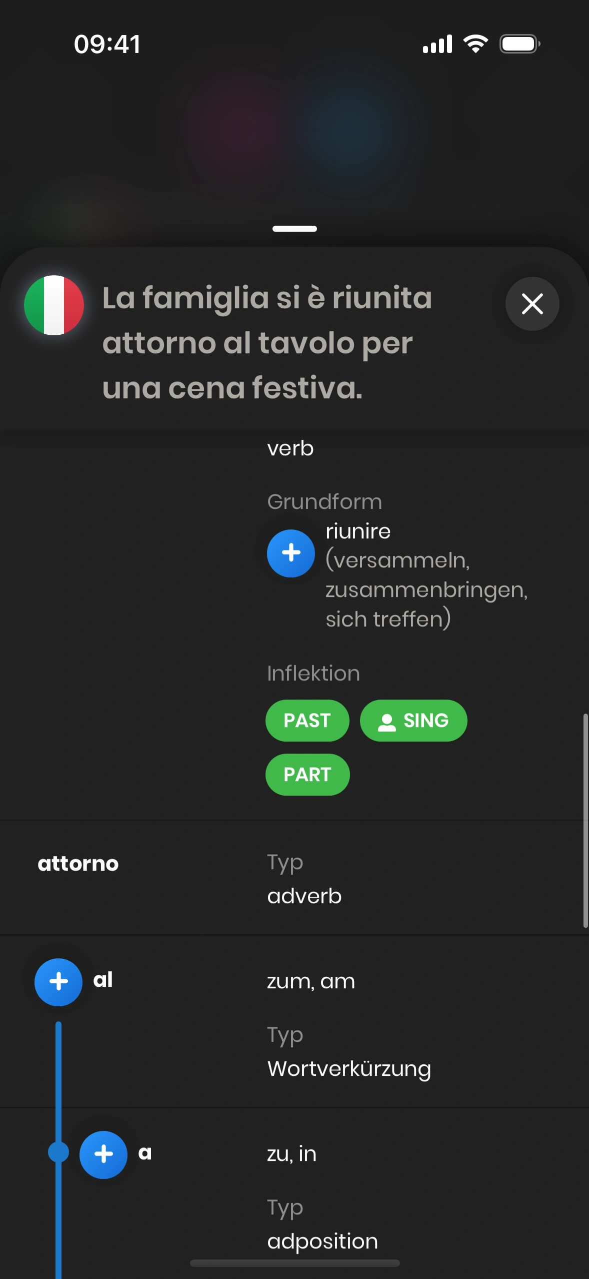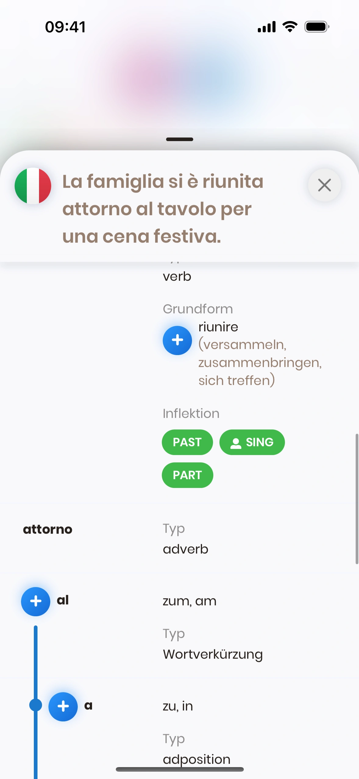 - Einzelnes Wort: Scrollbare Liste der Wörter im Satz. Im Beispiel: „riunita“.