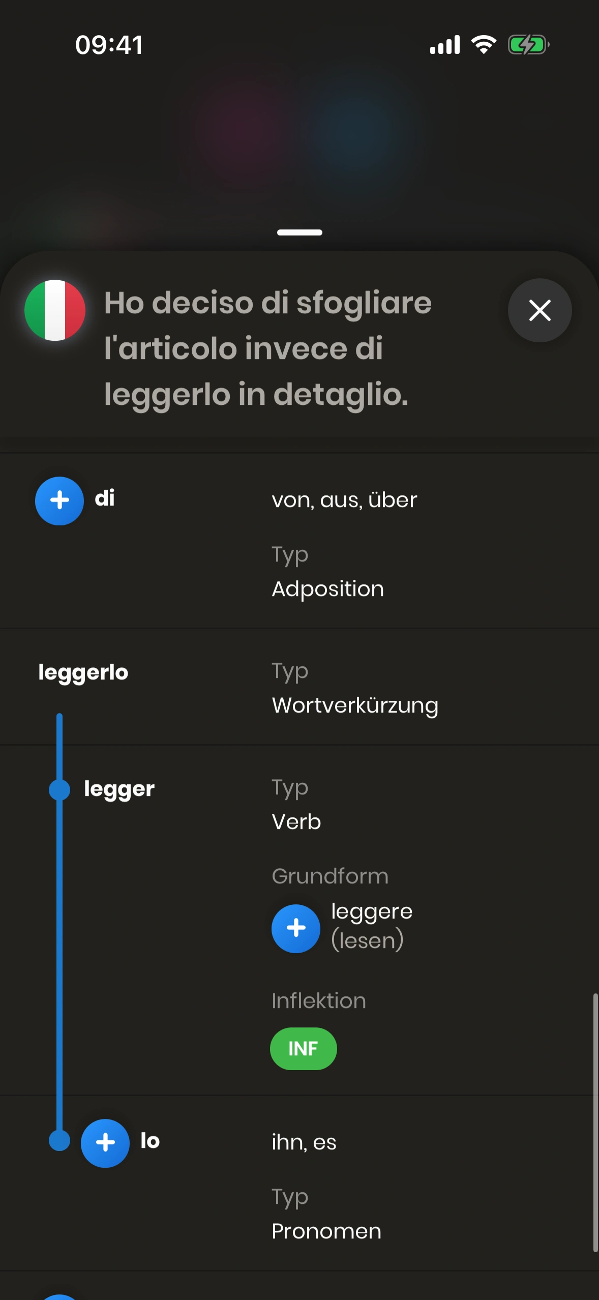 Der Satzstruktur‑Dialog erscheint, wenn du bei einer Satzkarte auf das (i) tippst – neben dem Satz in der Zielsprache.