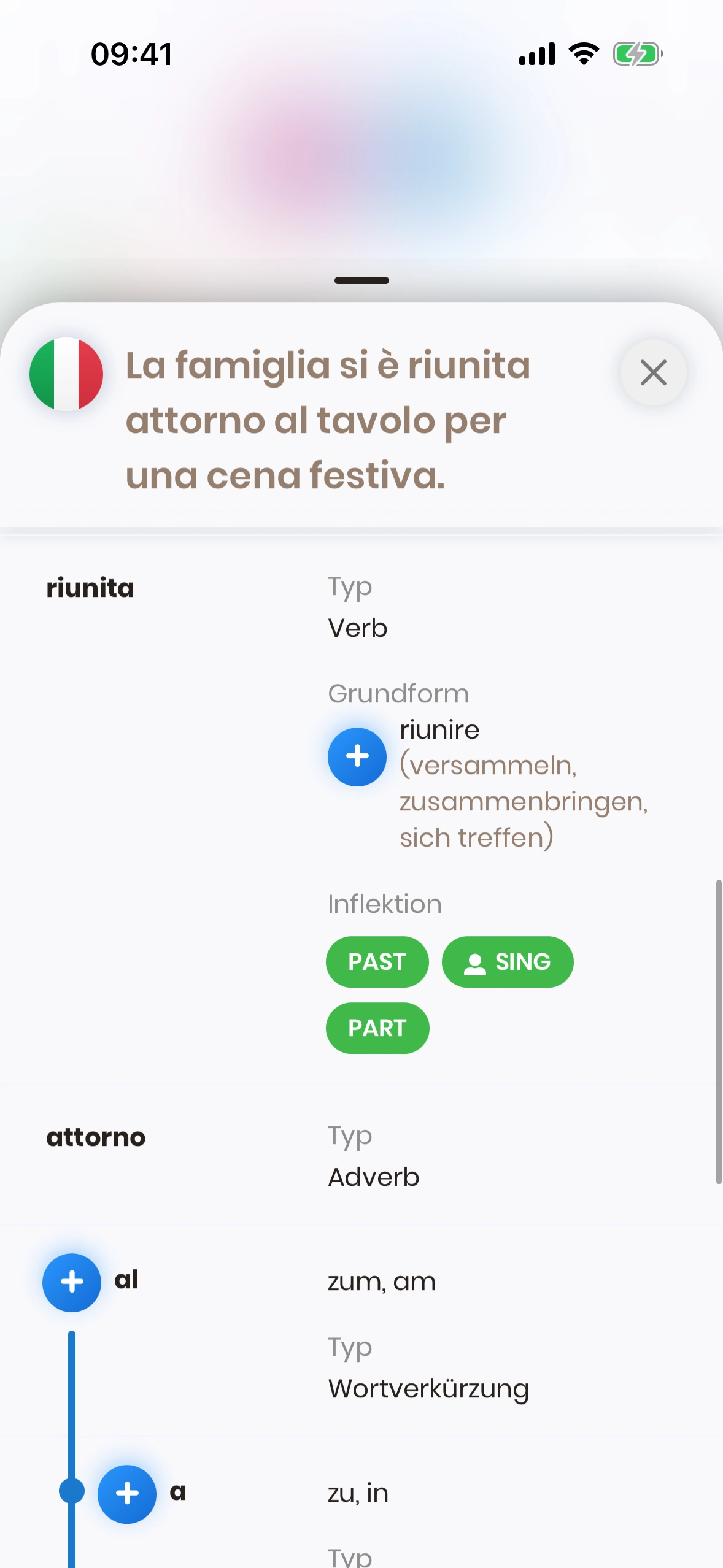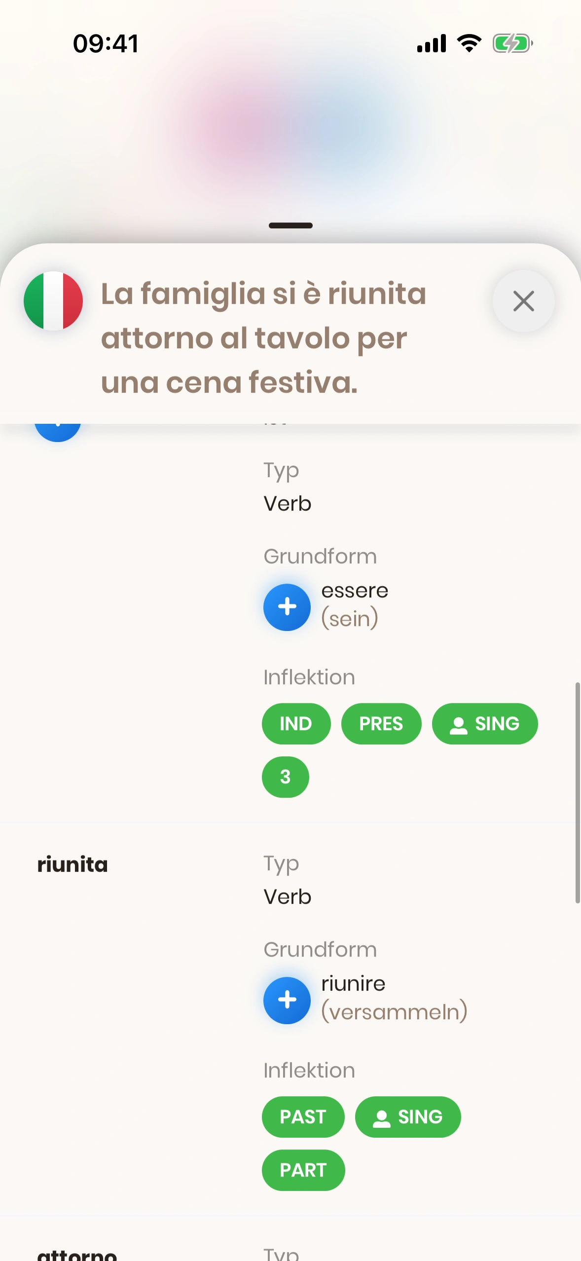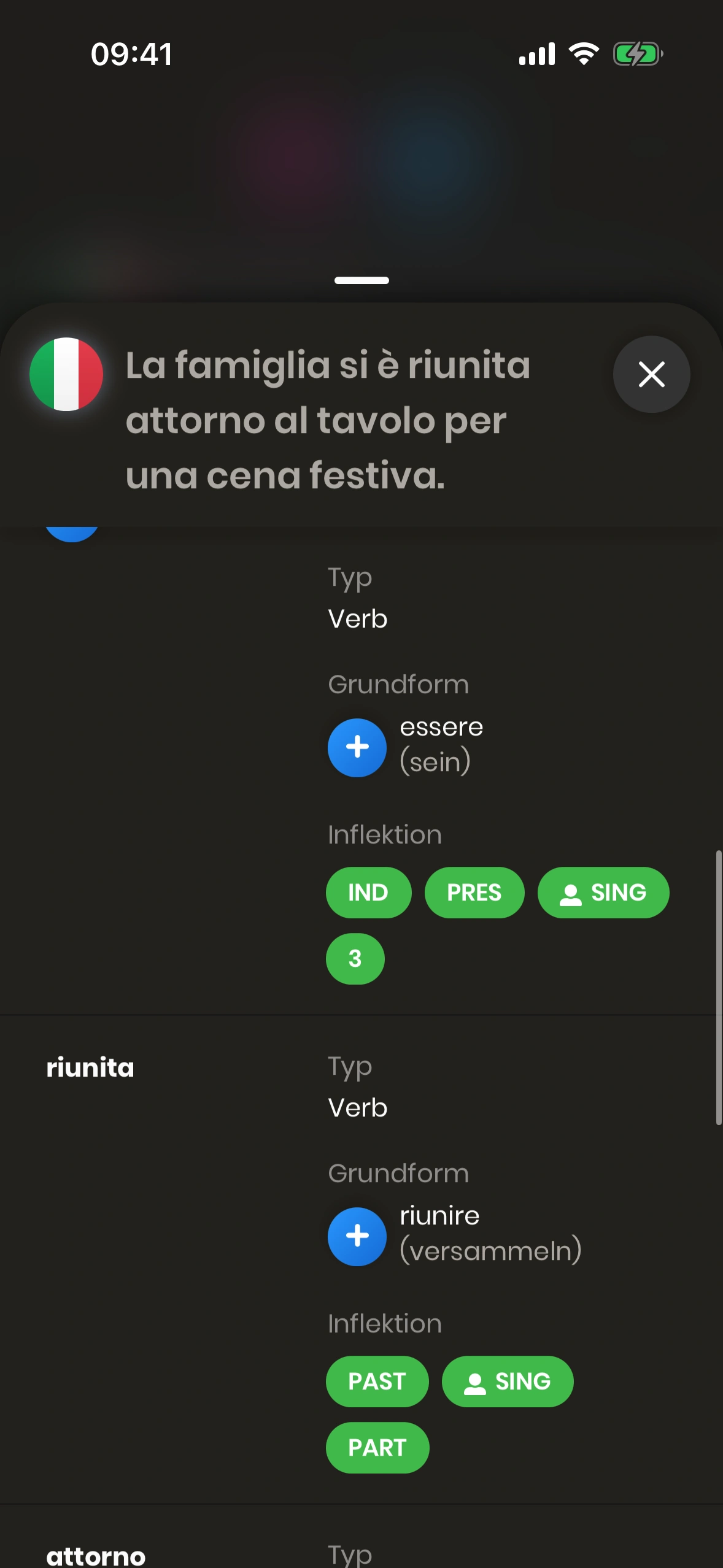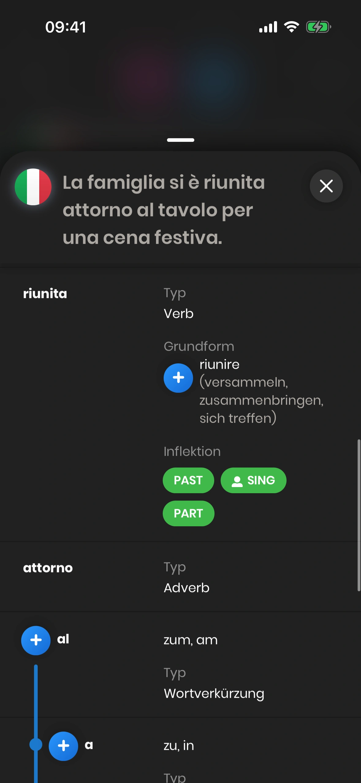 - Einzelnes Wort: Scrollbare Liste der Wörter im Satz. Im Beispiel: „riunita“.