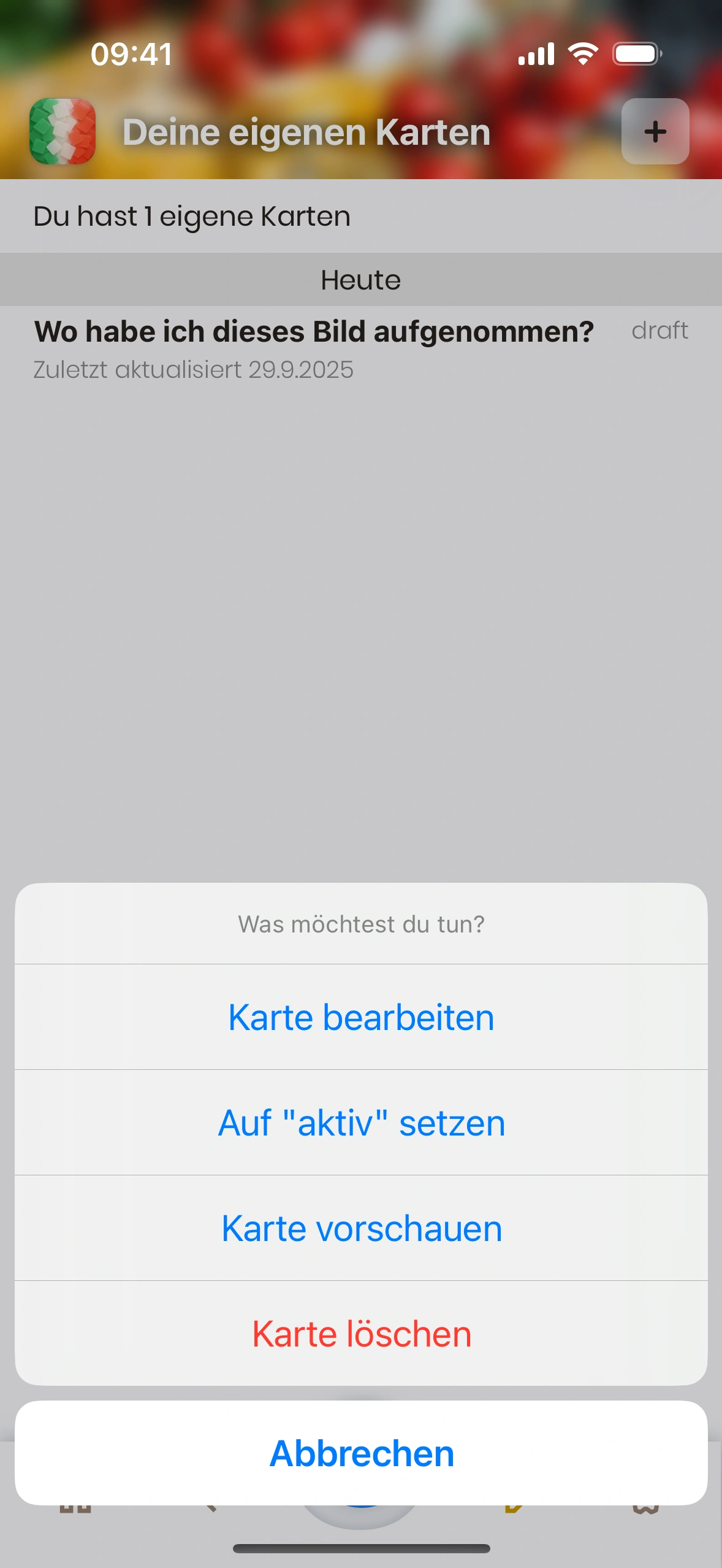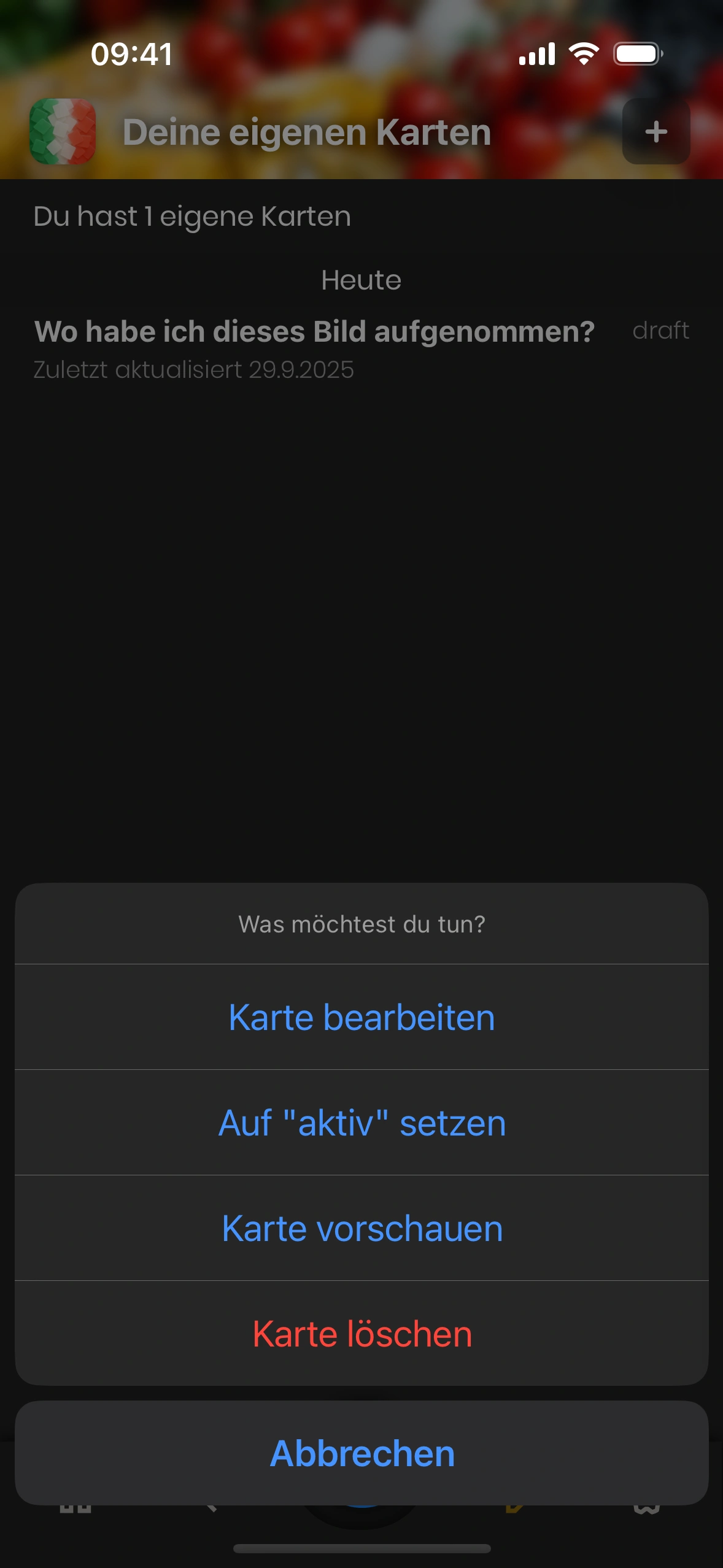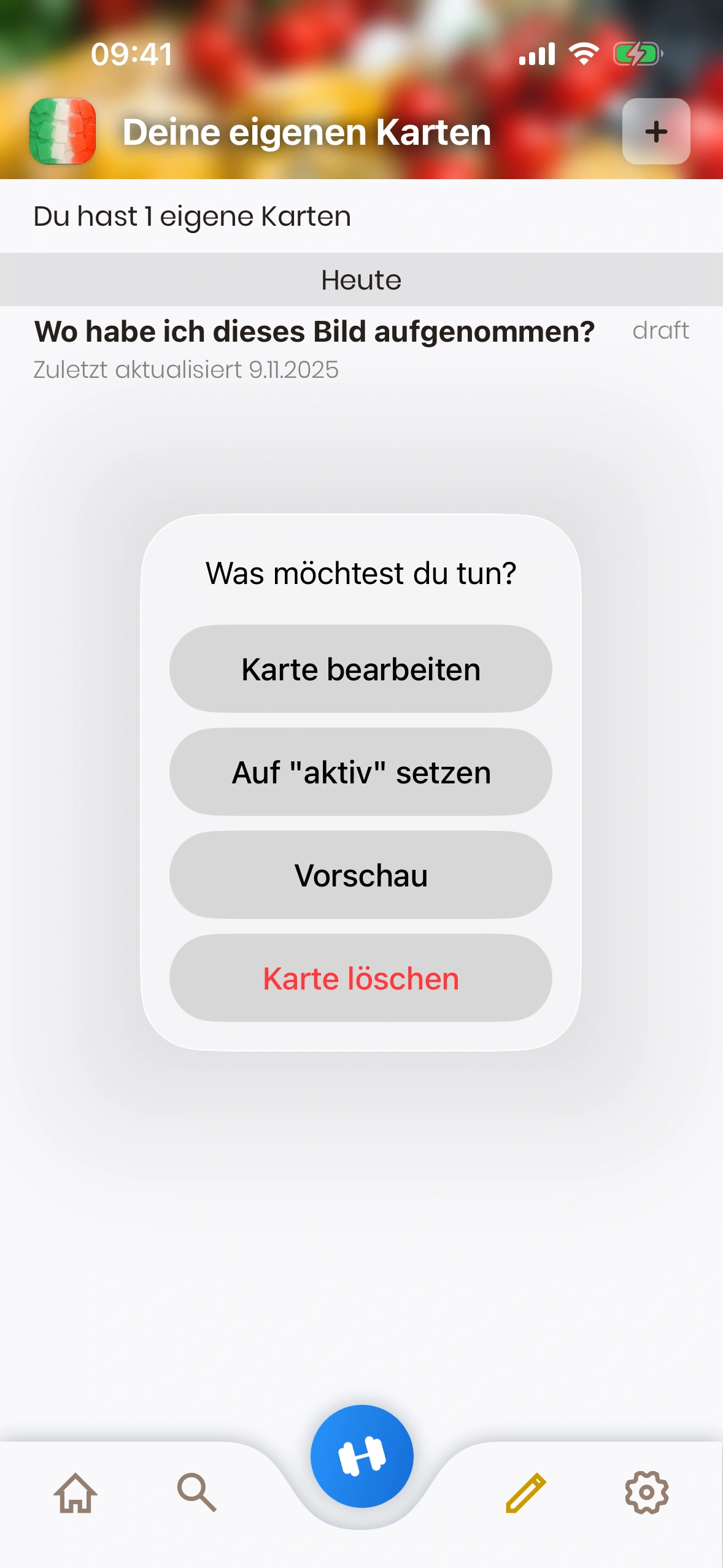 - Kartenstatus: Eine Eigene Karte ist entweder „Entwurf“ oder „Aktiv“. Entwürfe werden beim Lernen nicht gezeigt. Tippe die Karte, um den Status zu ändern.