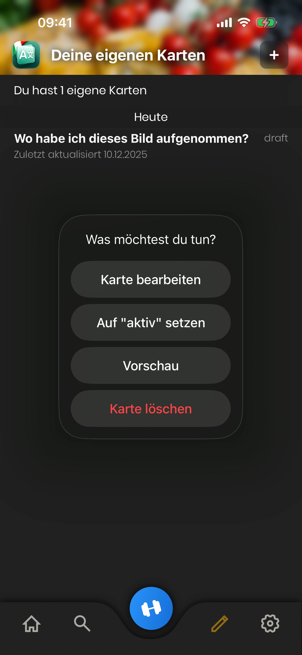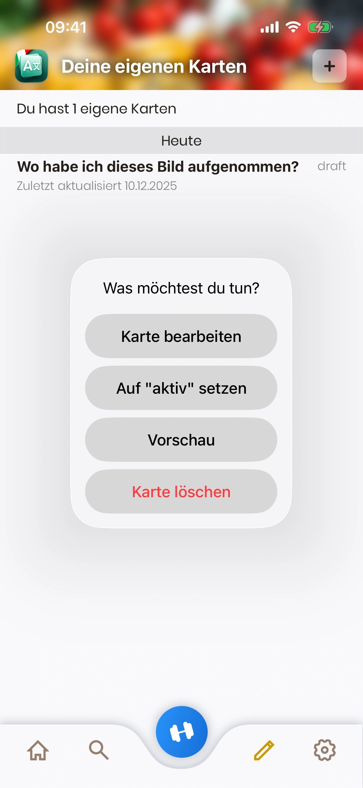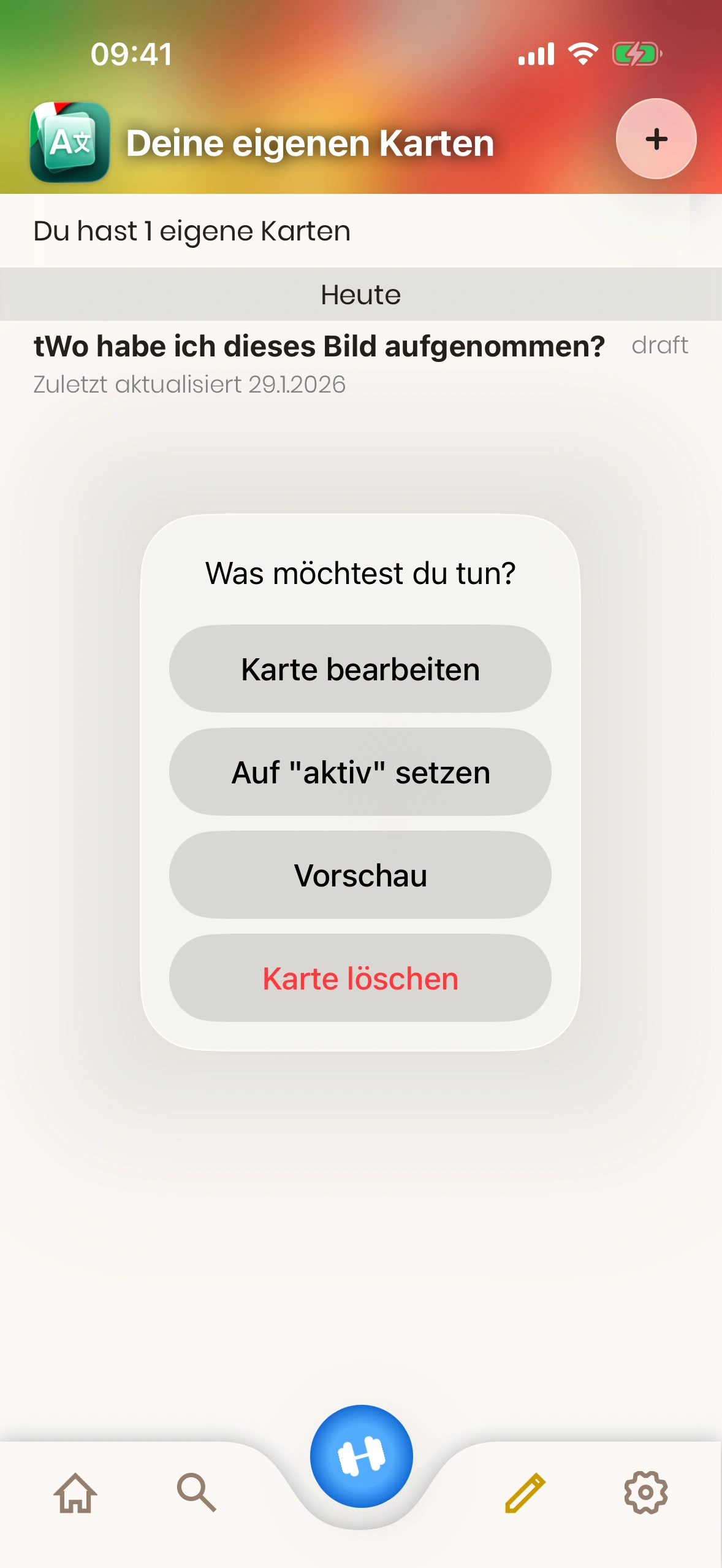 - Kartenstatus: Eine Eigene Karte ist entweder „Entwurf“ oder „Aktiv“. Entwürfe werden beim Lernen nicht gezeigt. Tippe die Karte, um den Status zu ändern.