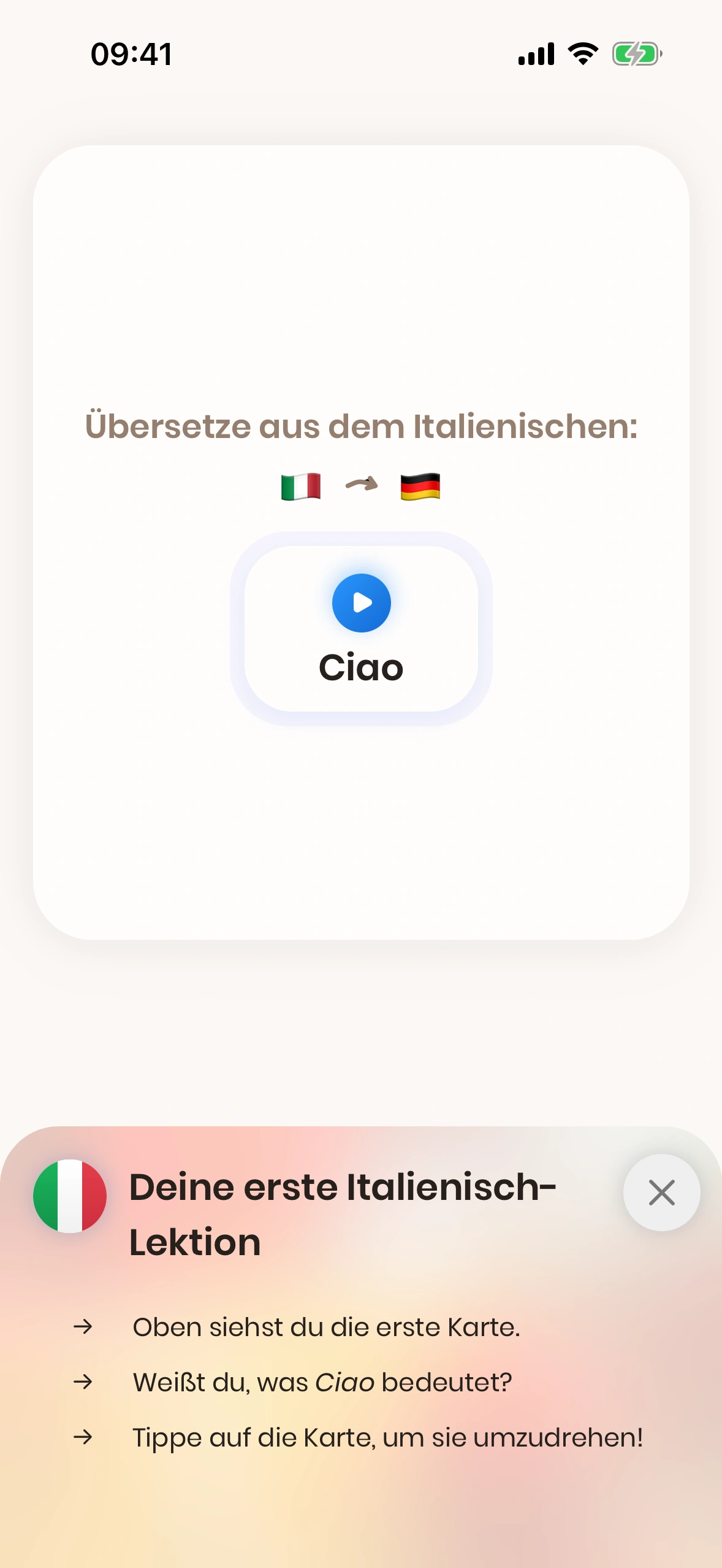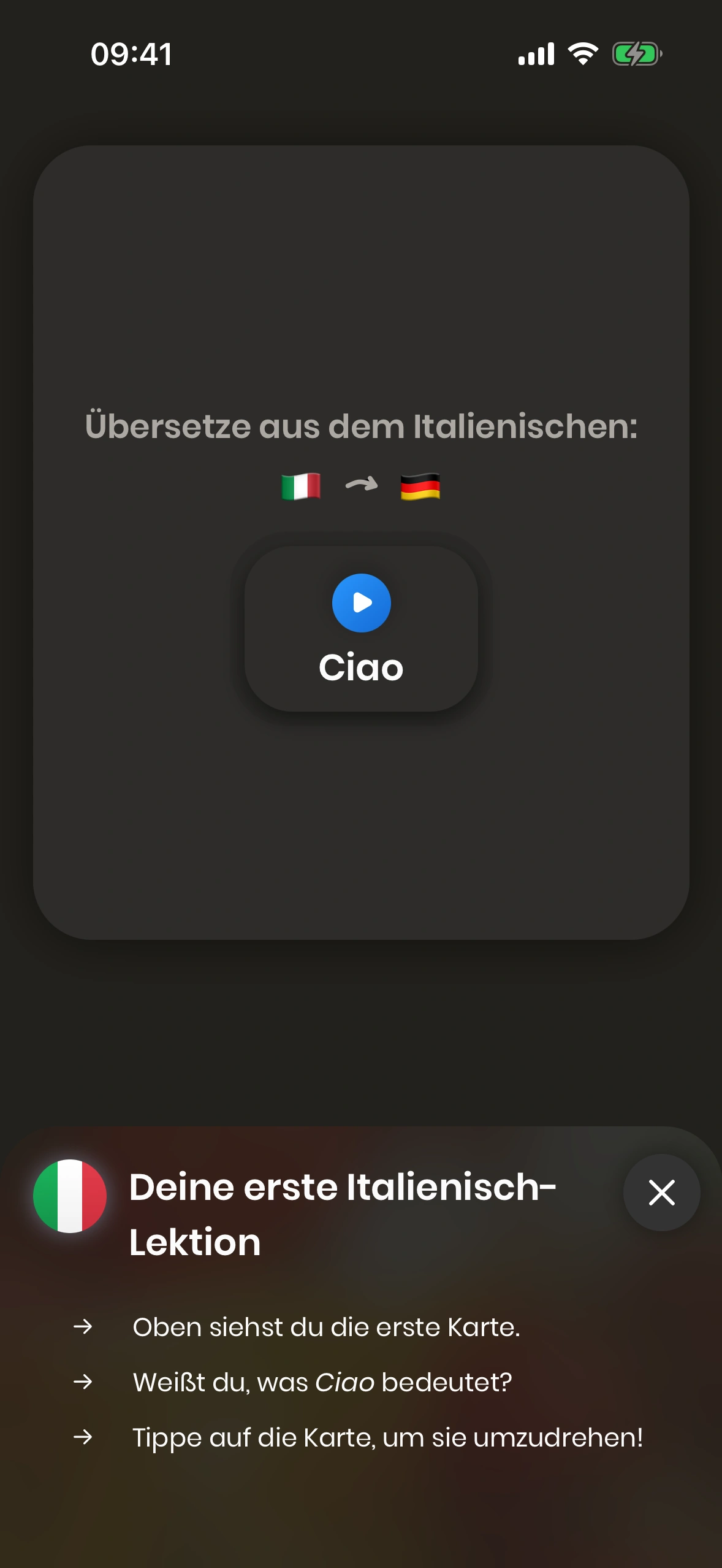 Wenn du Just Italian zum ersten Mal startest, wirst du durch das Tutorial geführt.