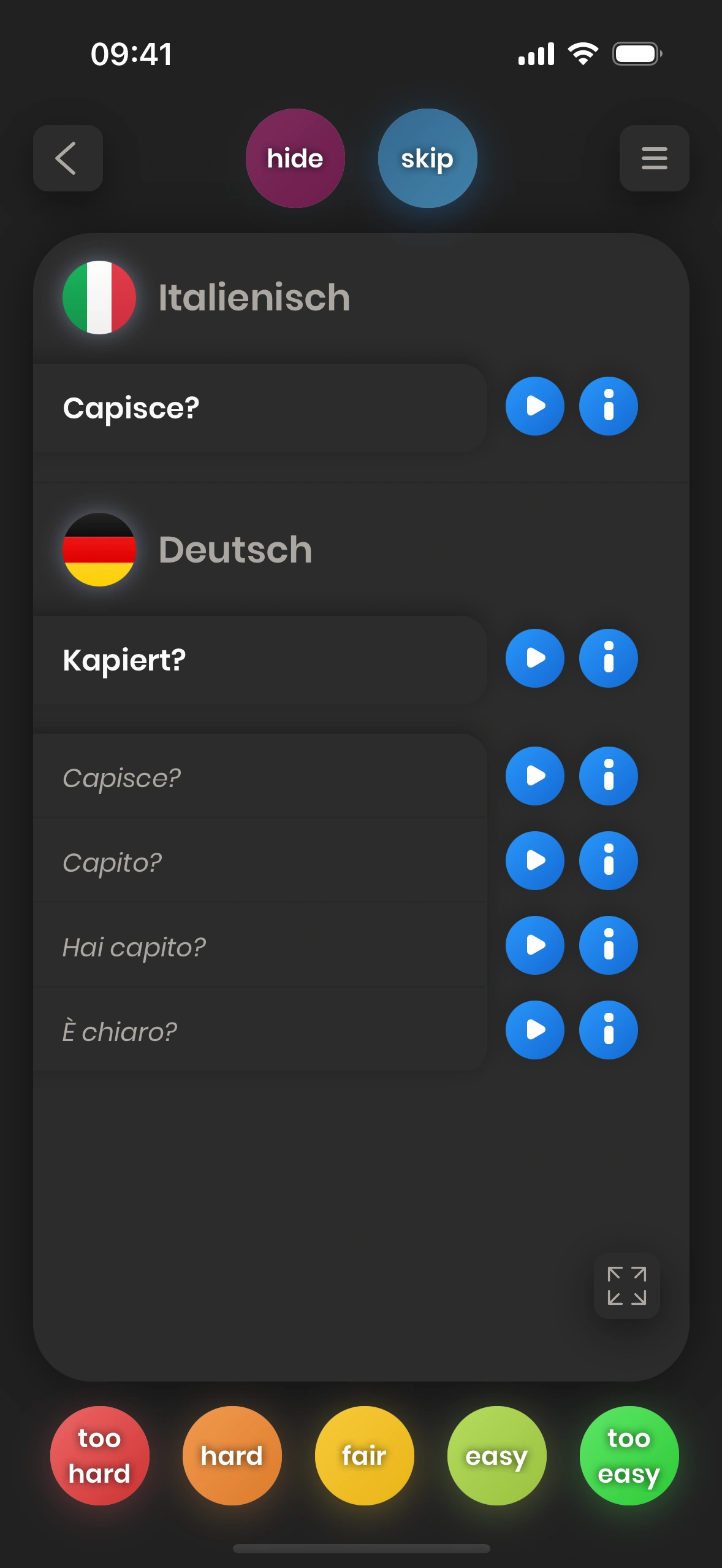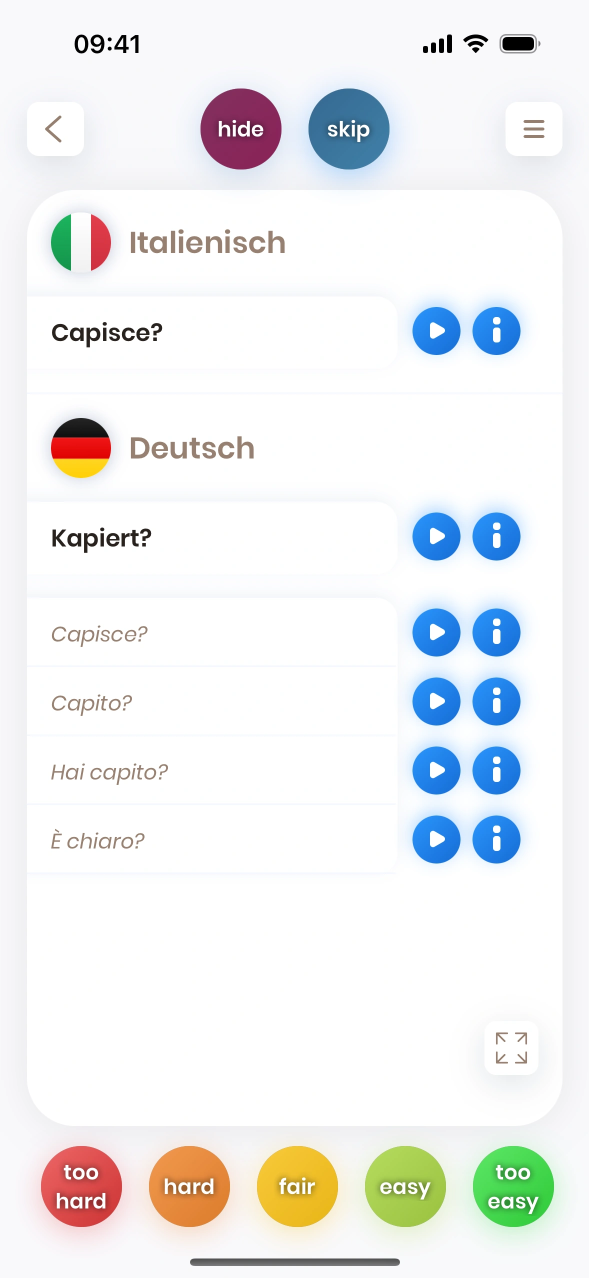 Wenn die Übersetzung eines Wortes oder einer Phrase für dich schwierig ist, dann musst du es öfter üben. Aus diesem Grund wird die Karte bald wieder gezeigt, wenn du einen roten Button wie too hard drückst, damit du das Wort oder die Phrase öfter üben kannst.