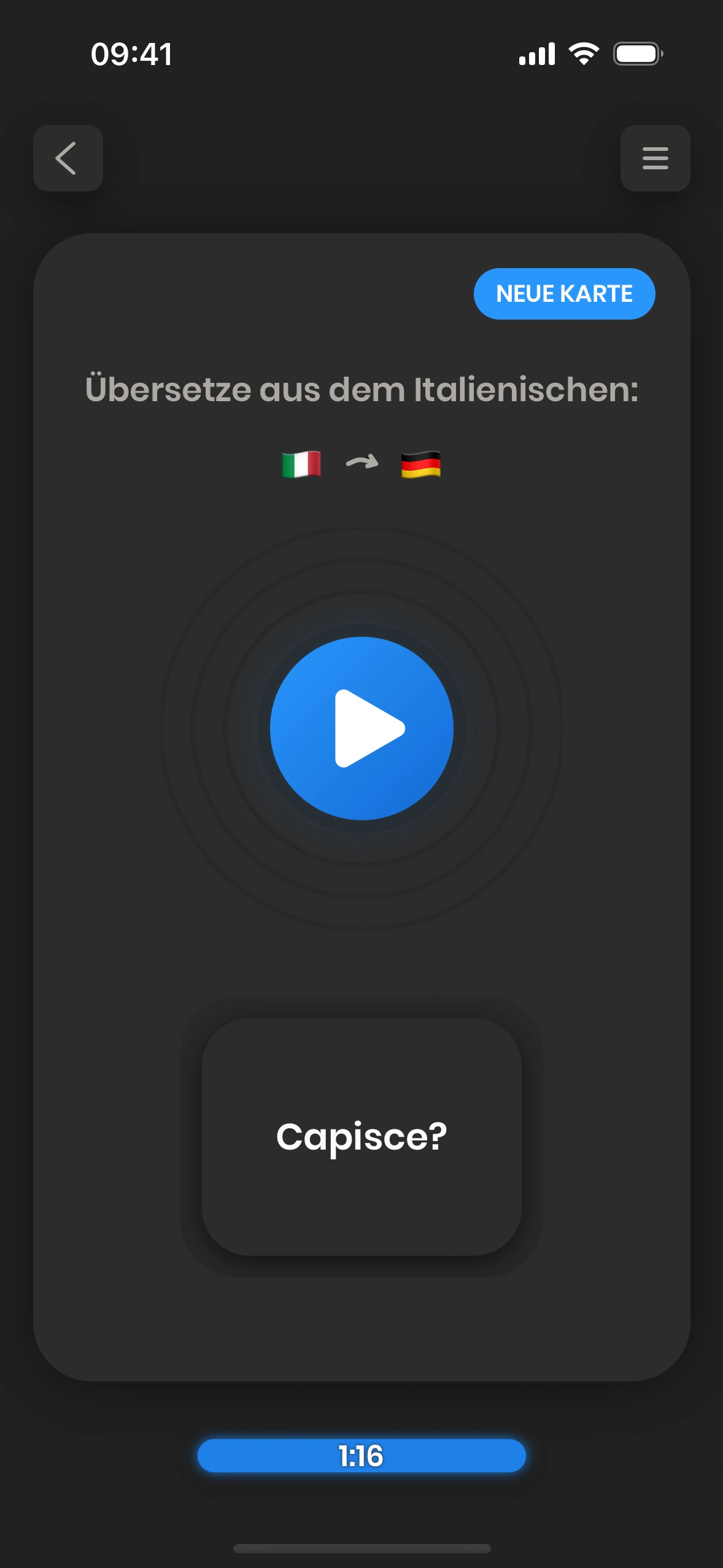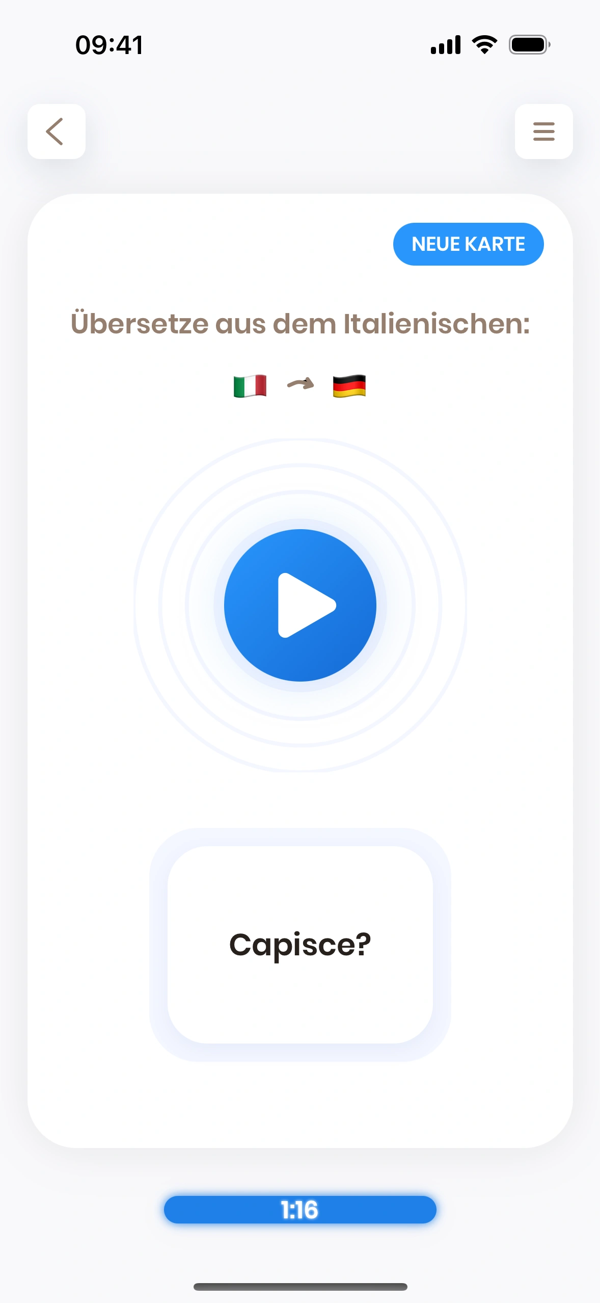 Just Italian ist eine Karteikarten-basierte App. Karteikarten sind Karten, die sowohl eine Vorder- als auch eine Rückseite haben. Du schaust dir die Vorderseite an und versuchst, das Wort (oder die Phrase) darauf zu übersetzen.
