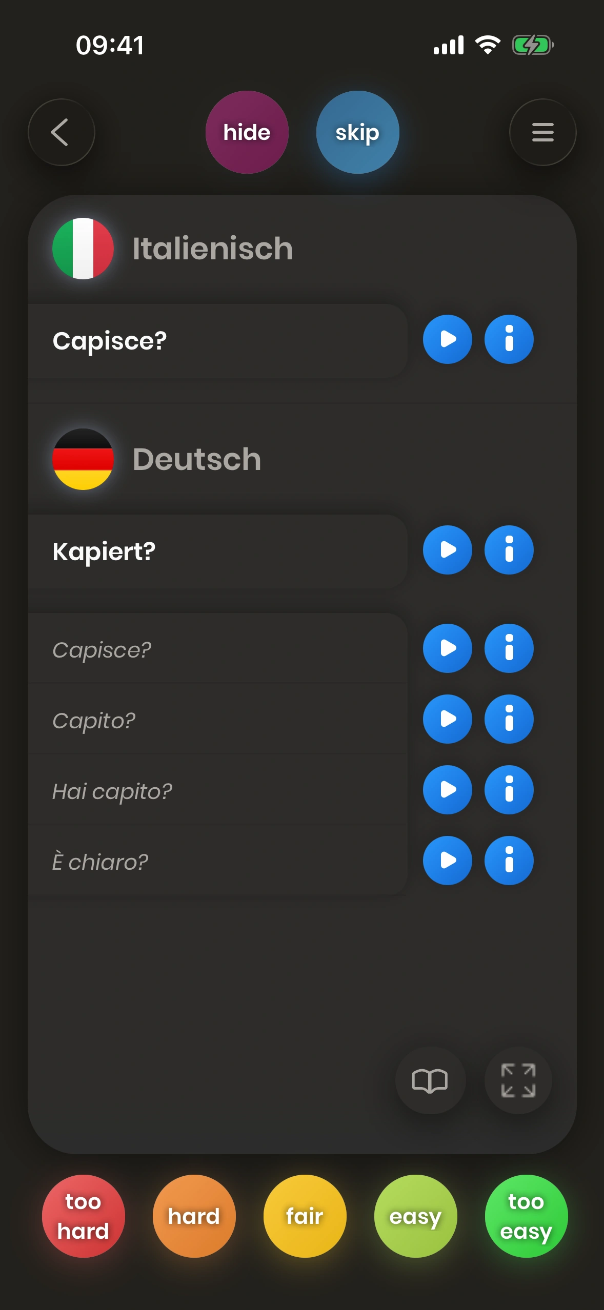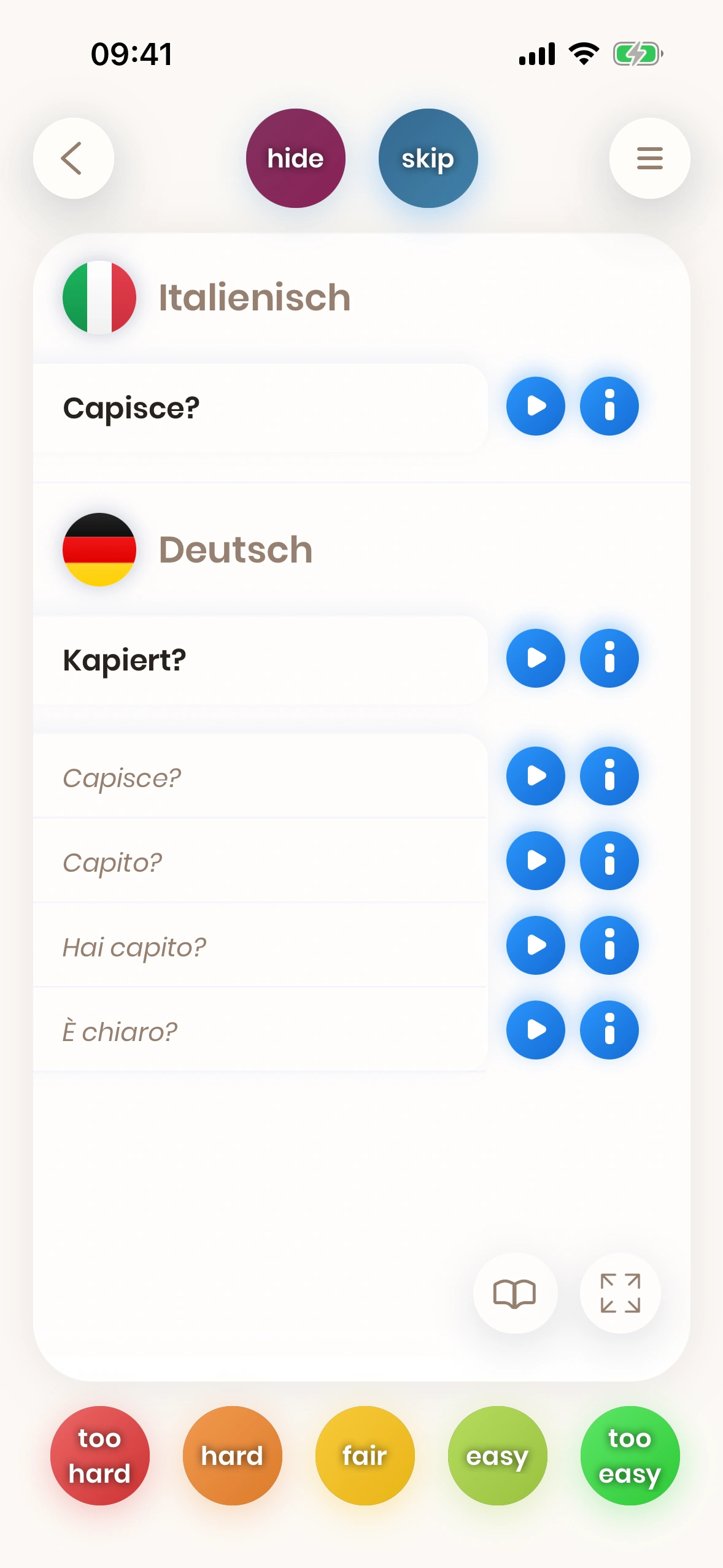 Wenn die Übersetzung eines Wortes oder einer Phrase für dich schwierig ist, dann musst du es öfter üben. Aus diesem Grund wird die Karte bald wieder gezeigt, wenn du einen roten Button wie too hard drückst, damit du das Wort oder die Phrase öfter üben kannst.