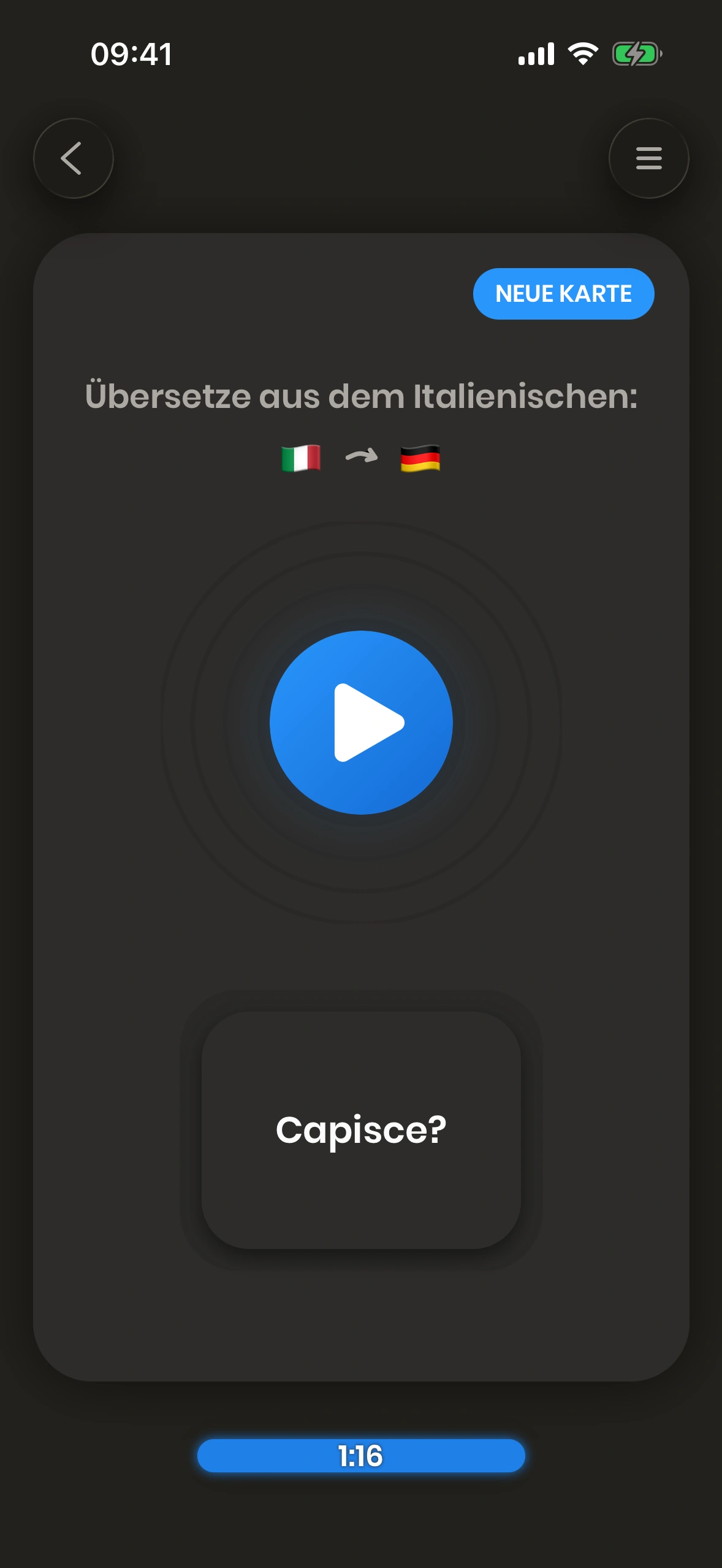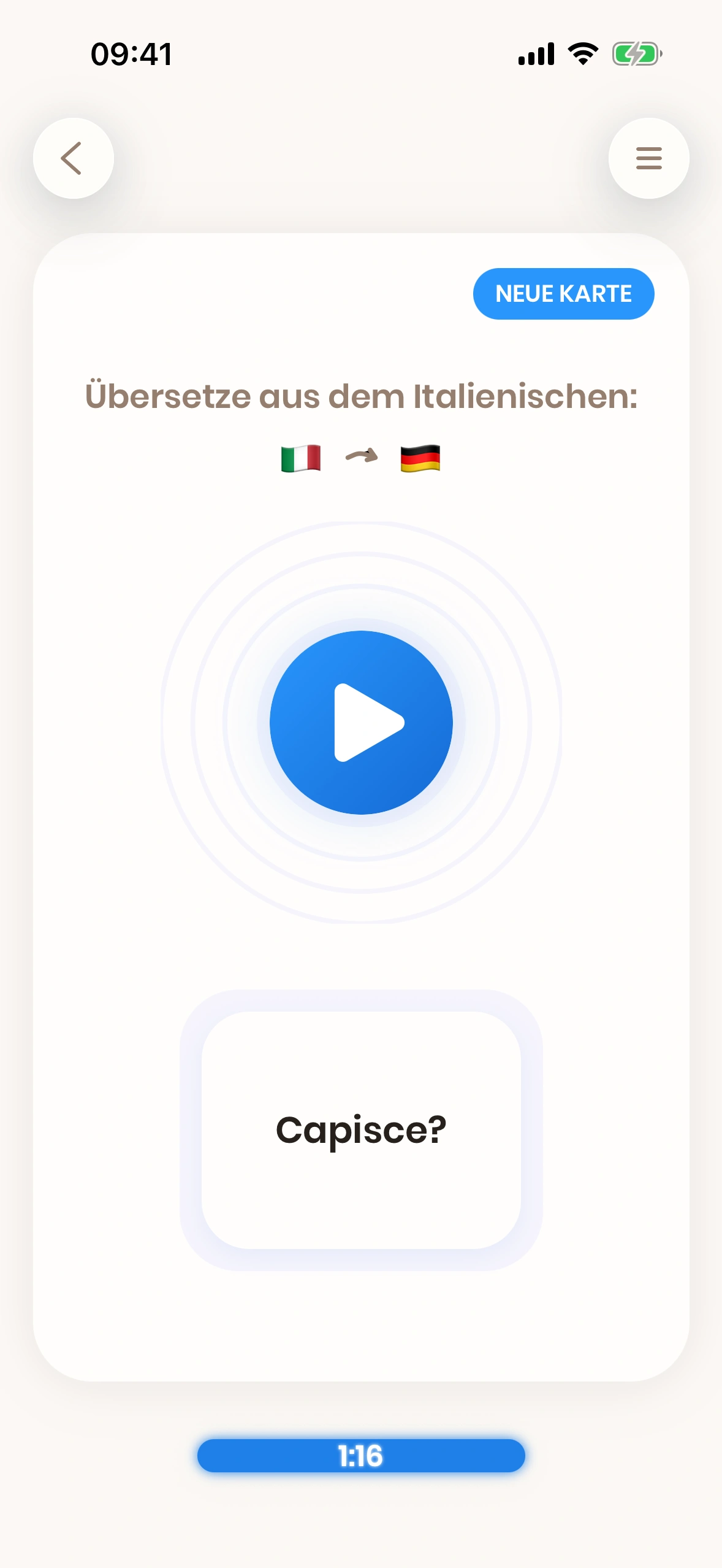 Just Italian ist eine Karteikarten-basierte App. Karteikarten sind Karten, die sowohl eine Vorder- als auch eine Rückseite haben. Du schaust dir die Vorderseite an und versuchst, das Wort (oder die Phrase) darauf zu übersetzen.