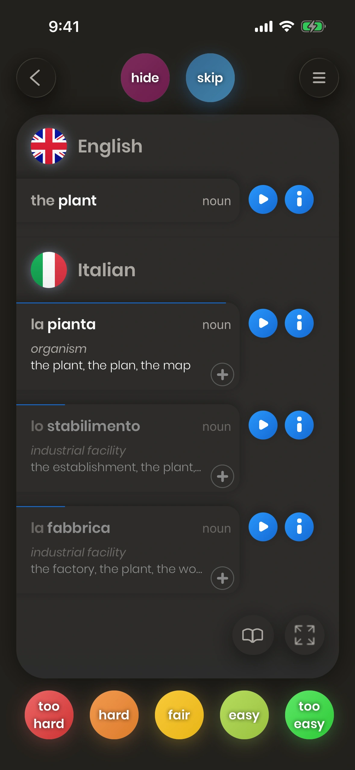 An Italian-to-English card shows you an Italian word, and lets you translate it.