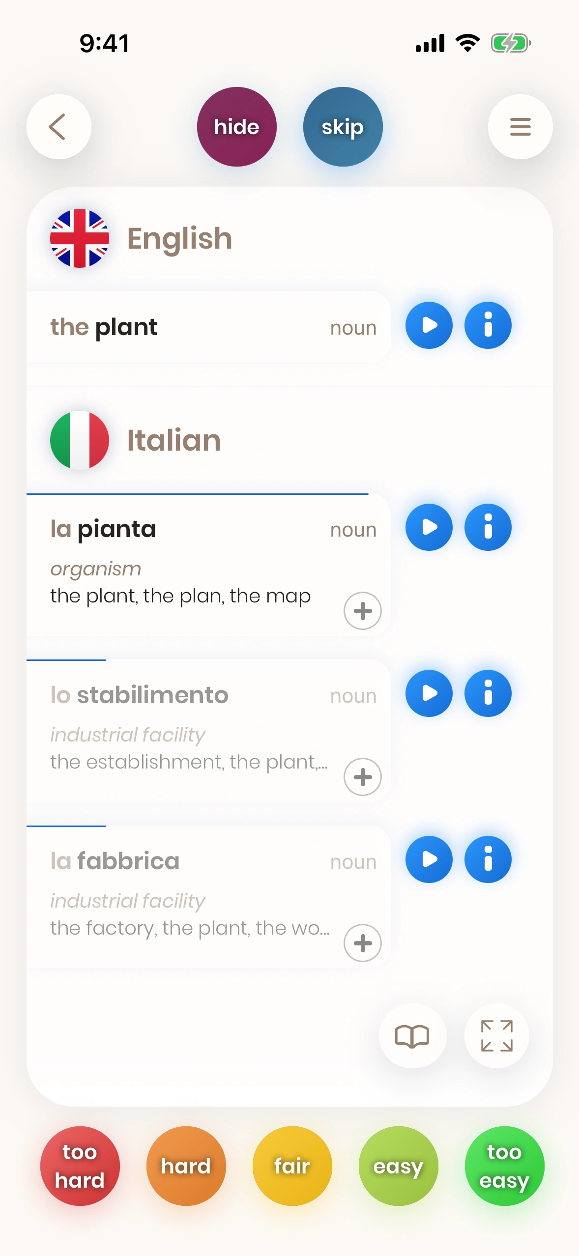 These cards train your passive vocabulary. You learn to understand Italian words, but you might not yet use them actively.