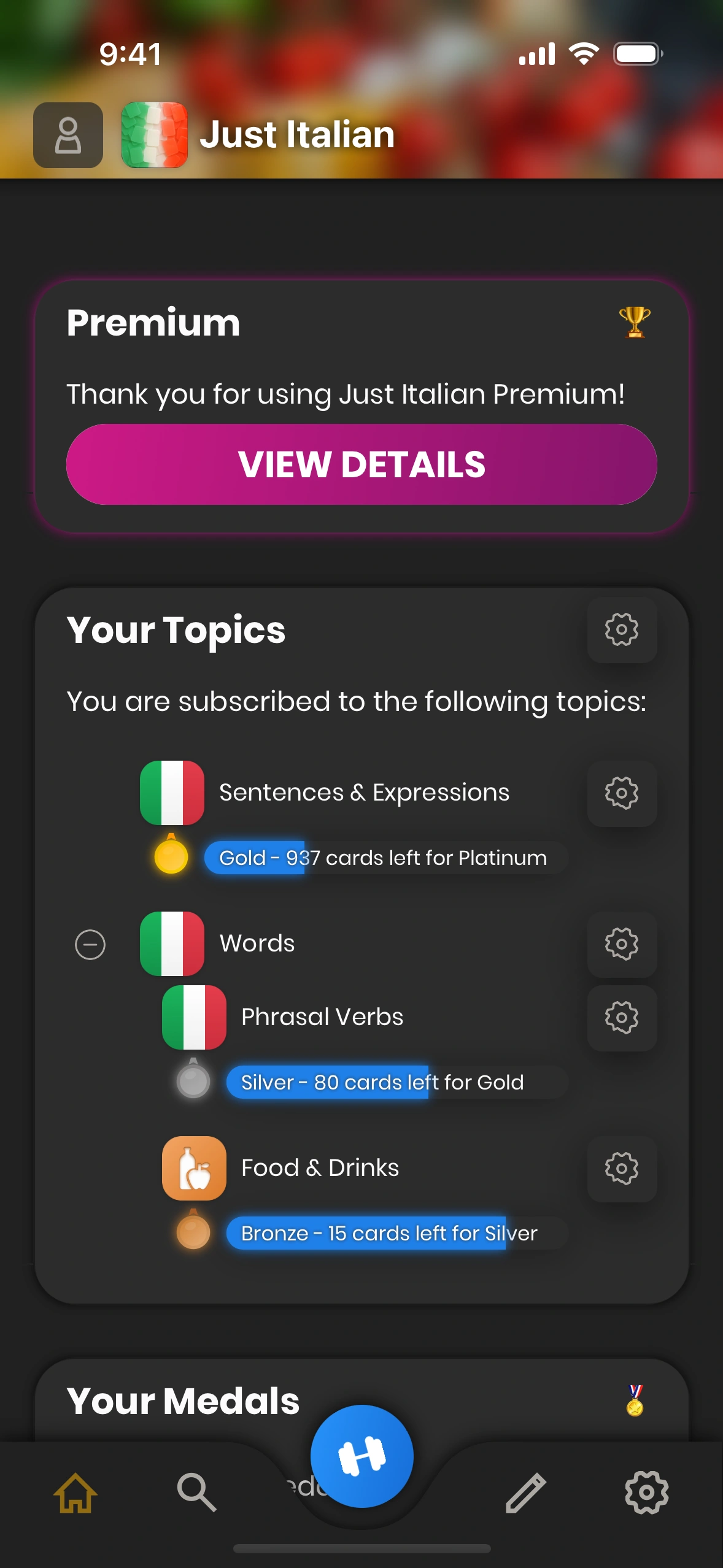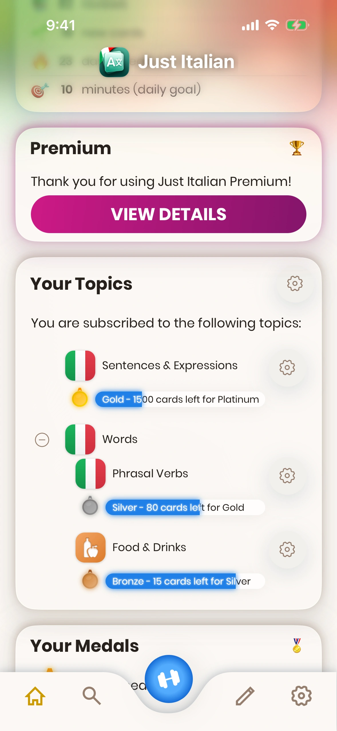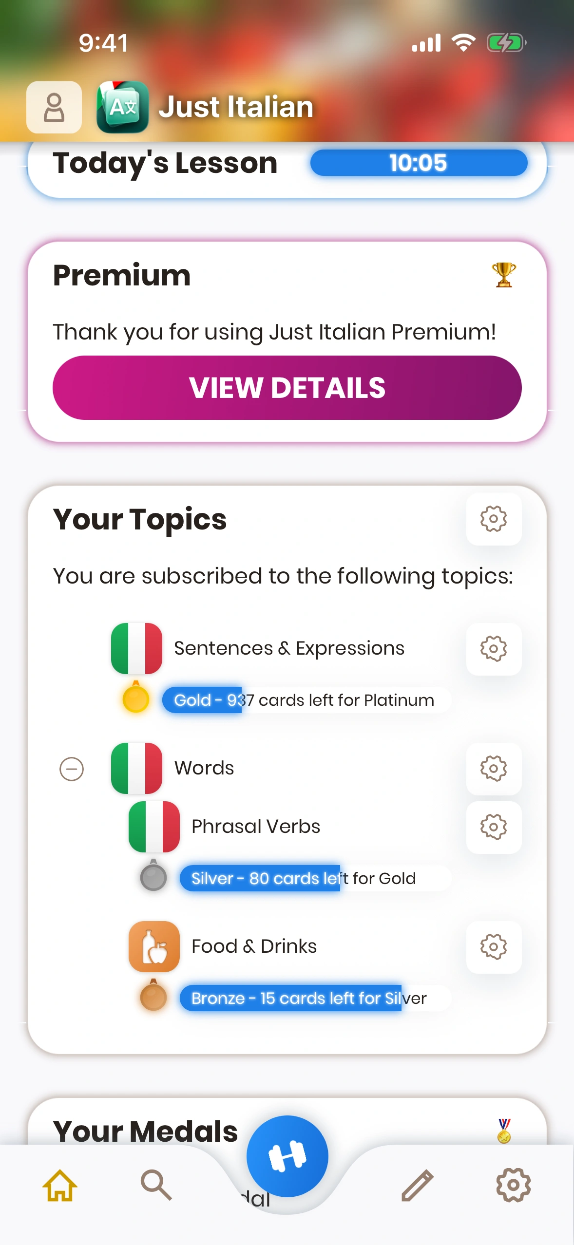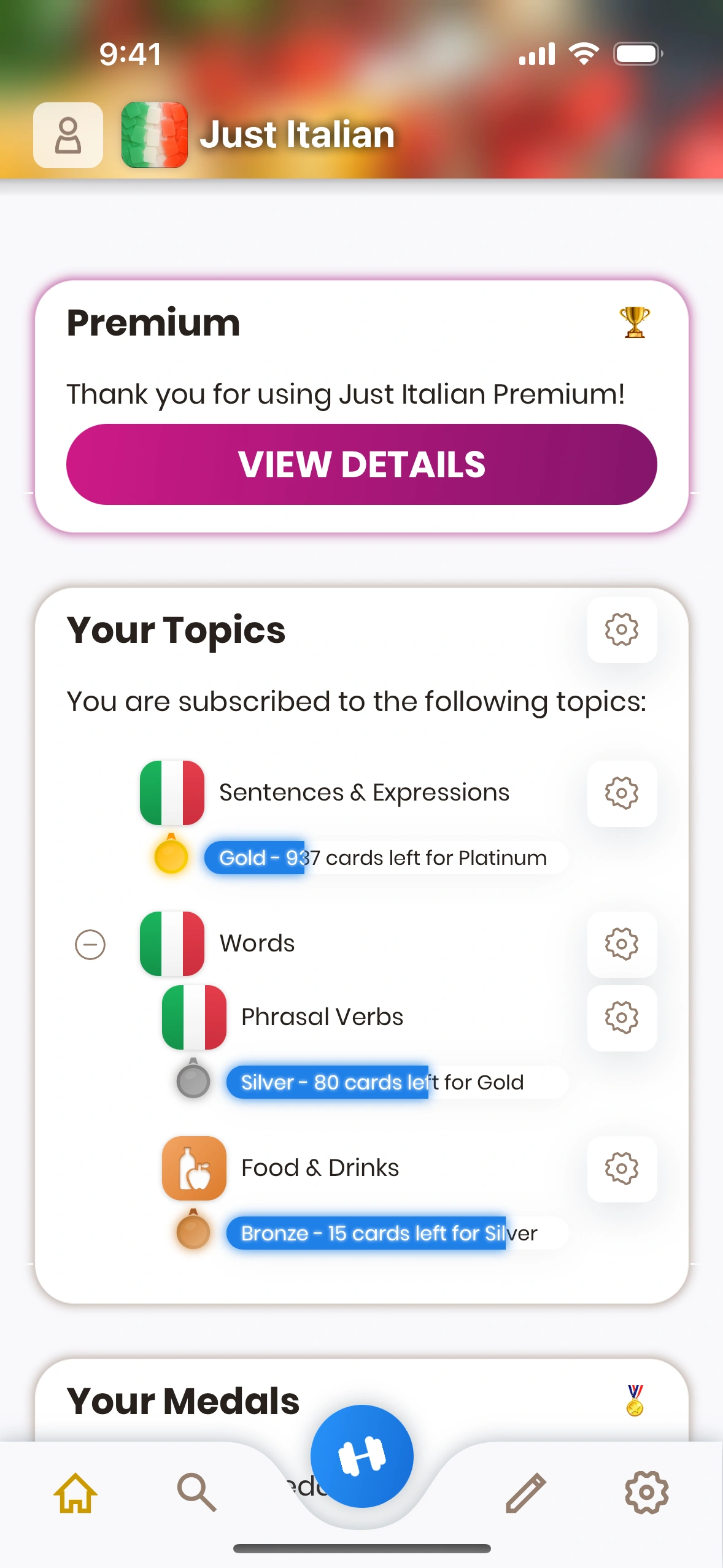 After having completed the tutorial, or when logged in, you will be presented with the Home Screen after having started Just Italian.