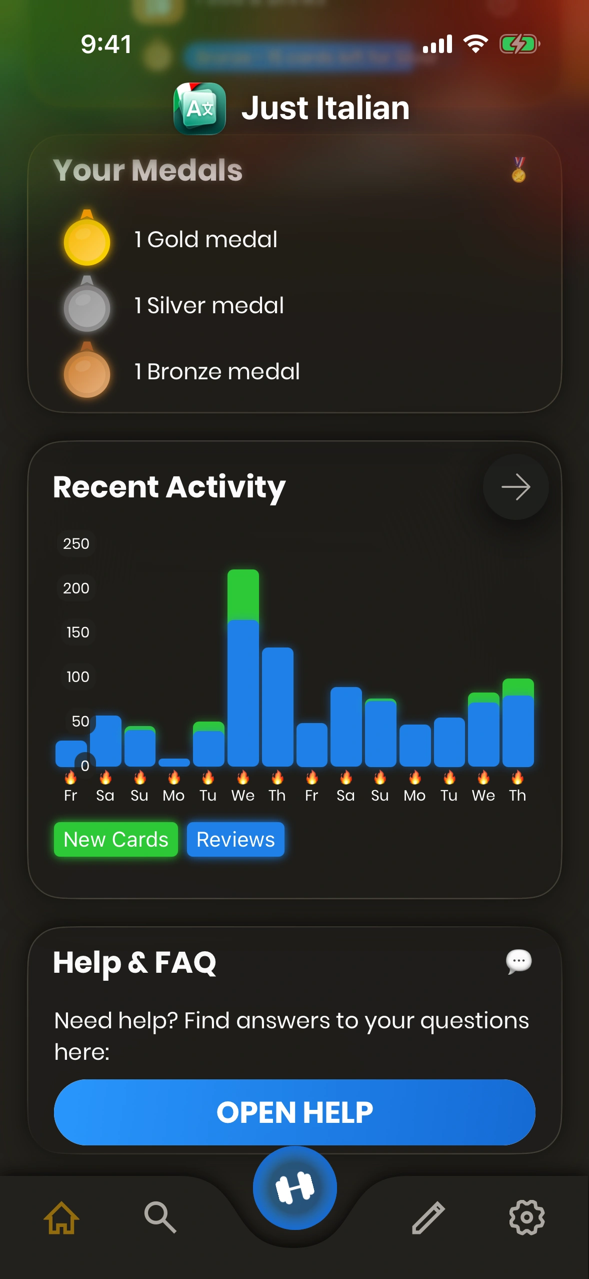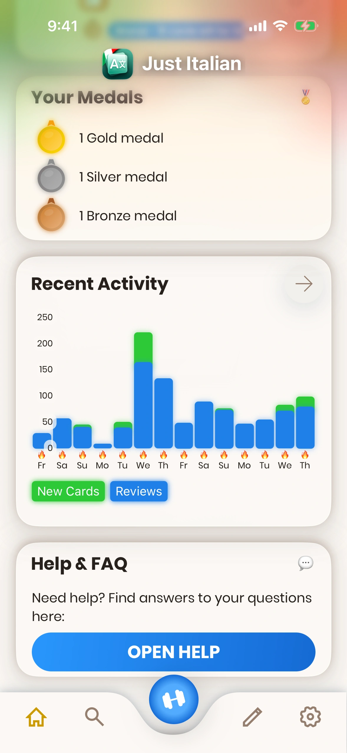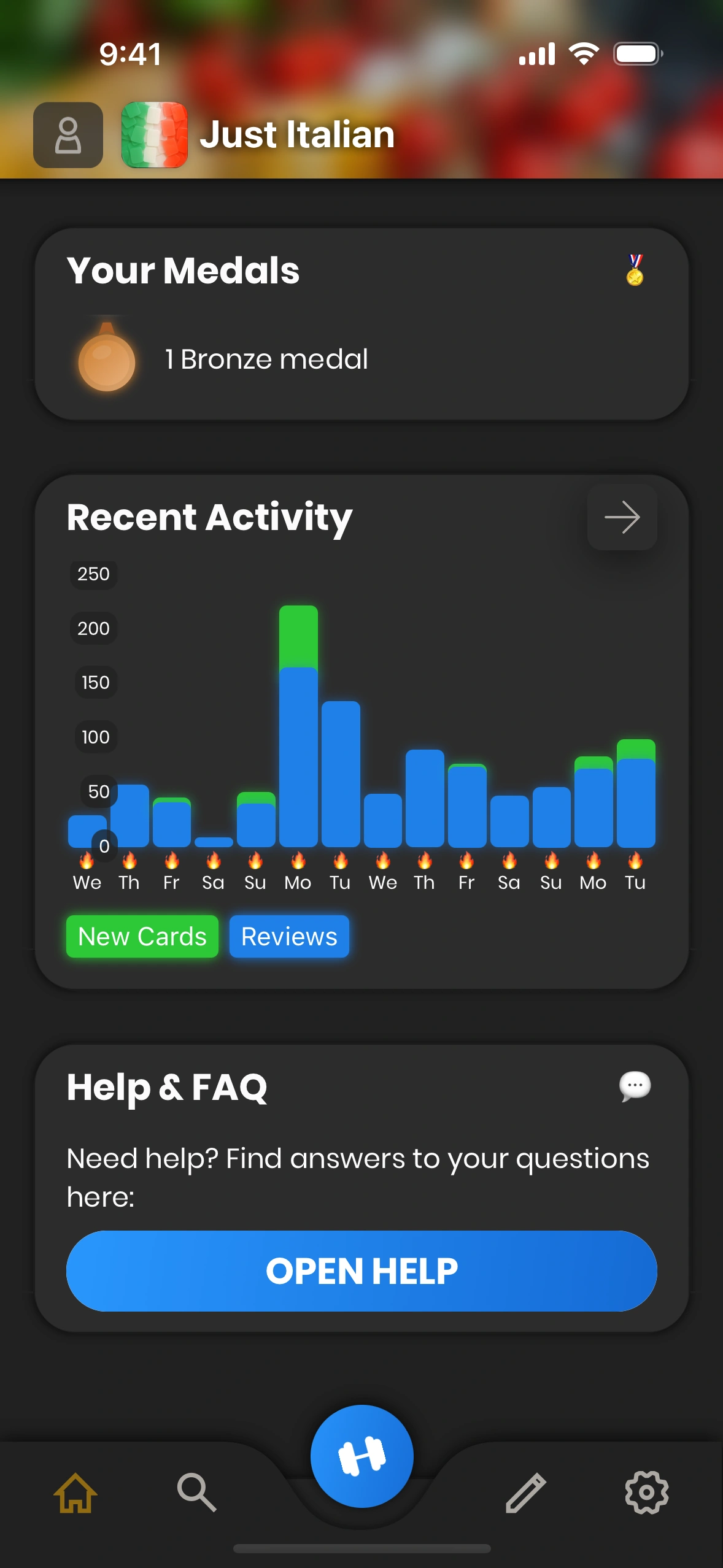 - Settings: Tap this cog symbol to change the app settings. which-cards-do-i-learn#new-cards) learned today, as well as your current streak.