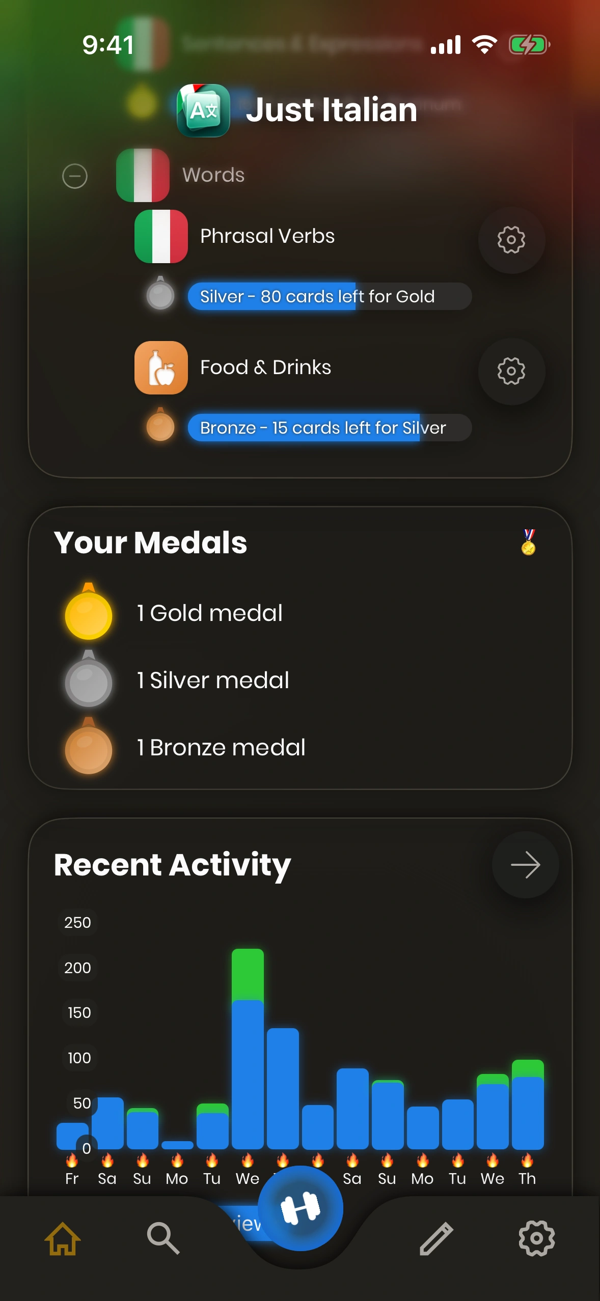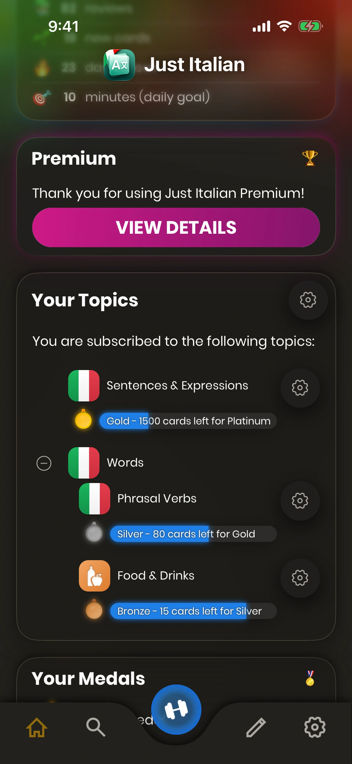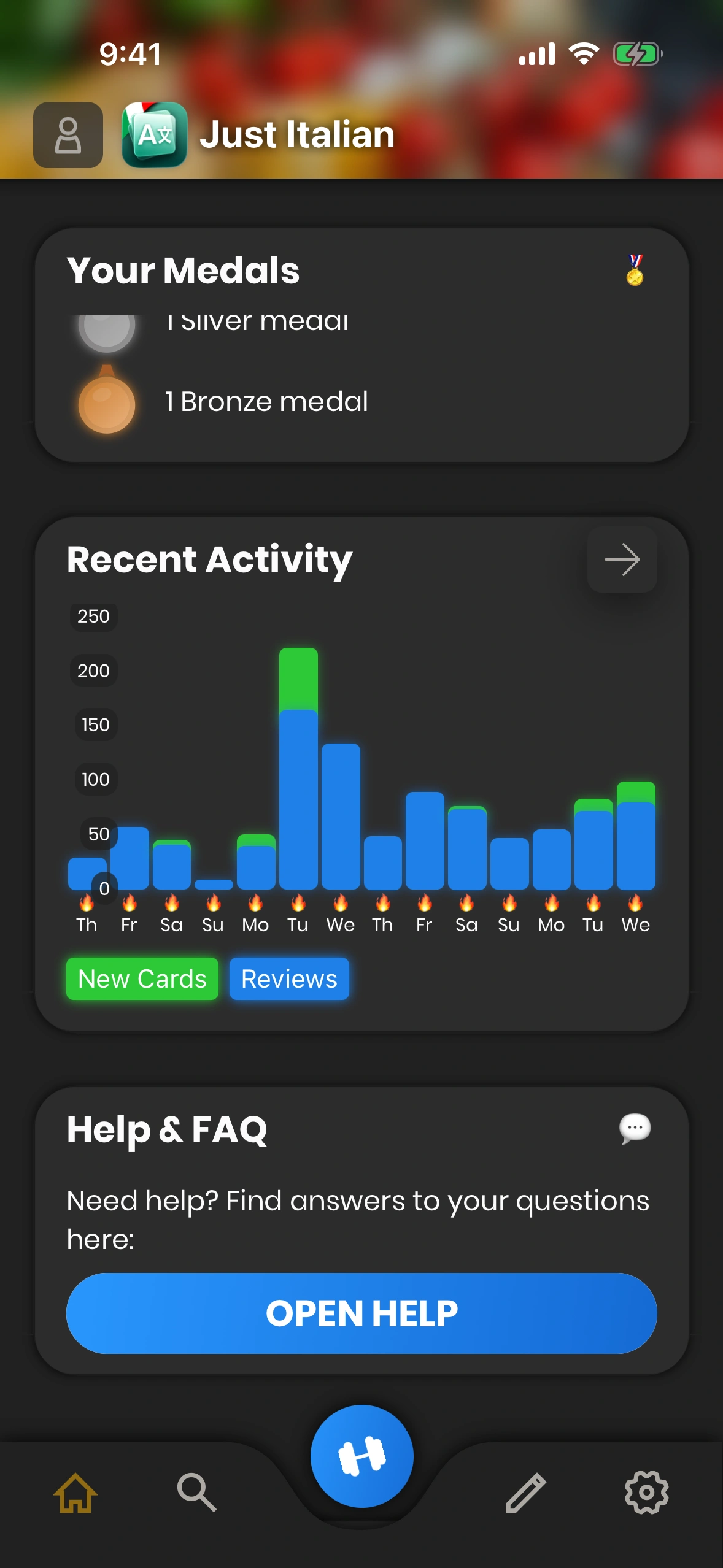 - Settings: Tap this cog symbol to change the app settings. which-cards-do-i-learn#new-cards) learned today, as well as your current streak.