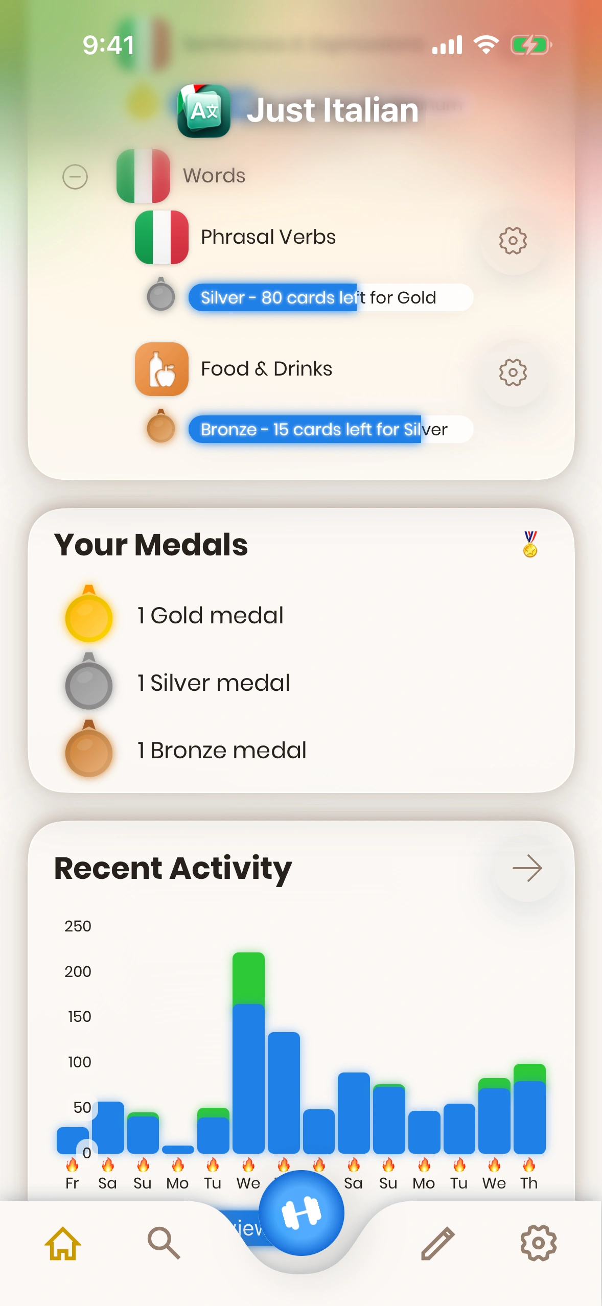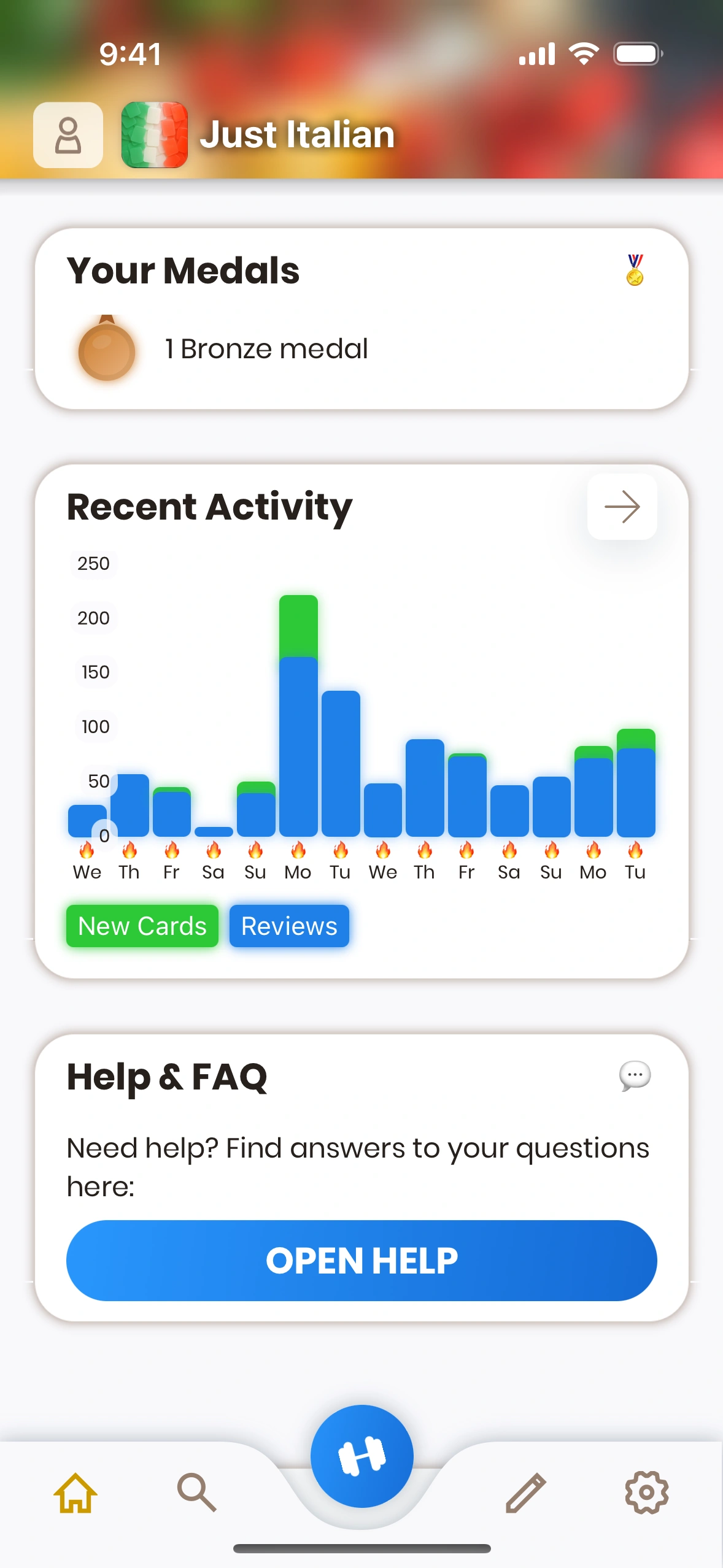 - Recent Activity: Here you can see your activity during the last days. Reviews are shown in blue, while new cards are green. Days with a 🔥 symbol are the days you have reached your daily goal (streak days). With the arrow button, you can also see more details about you activity history.
