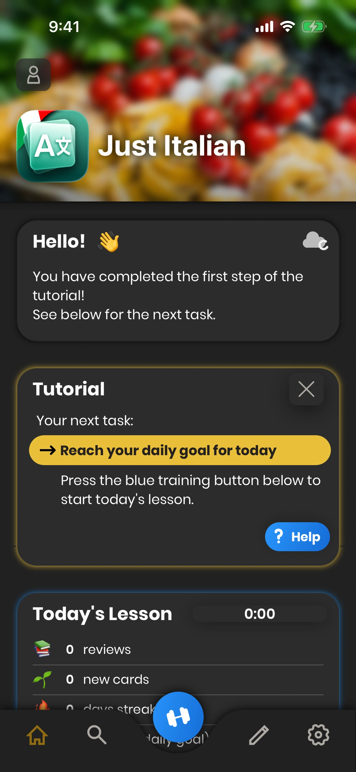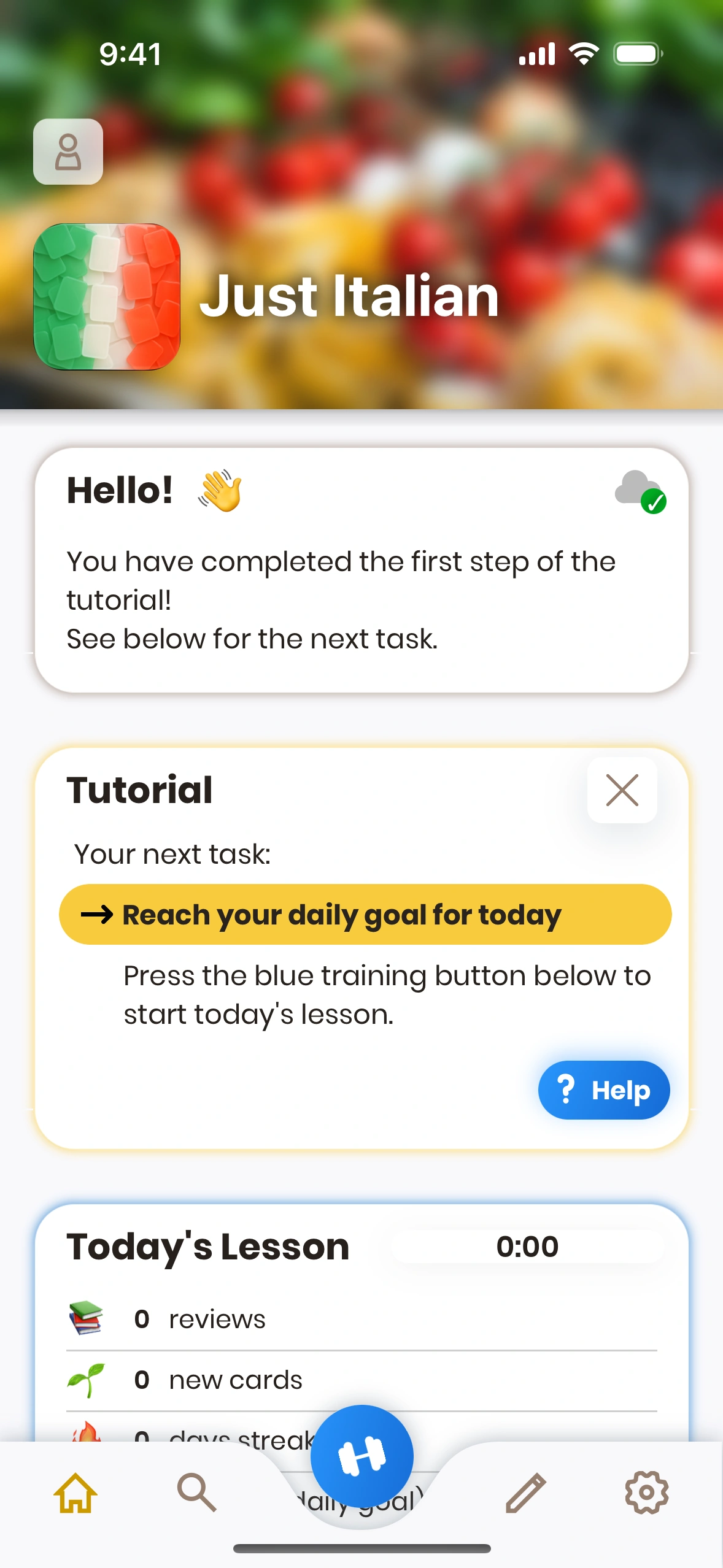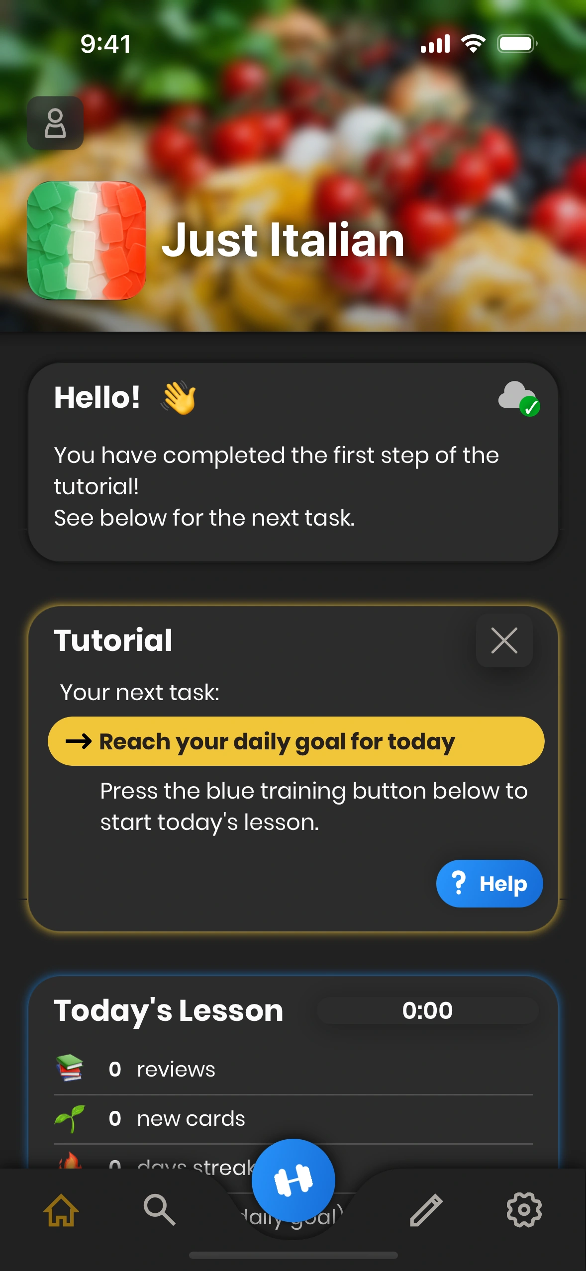 After you have completed the tutorial that lets you make the first steps through the app, Just Italian presents a few tasks to you. Each of these tasks guides you through a specific function of the app.