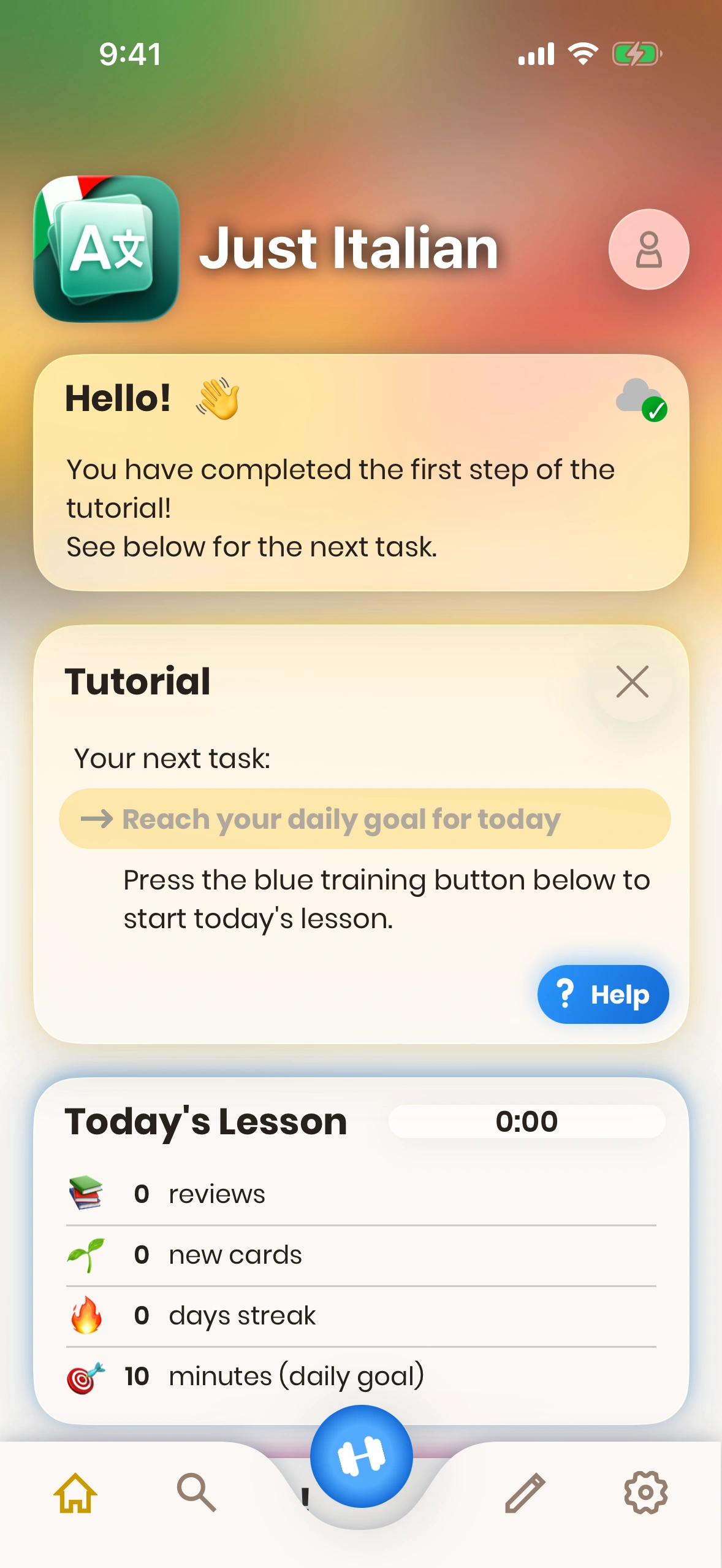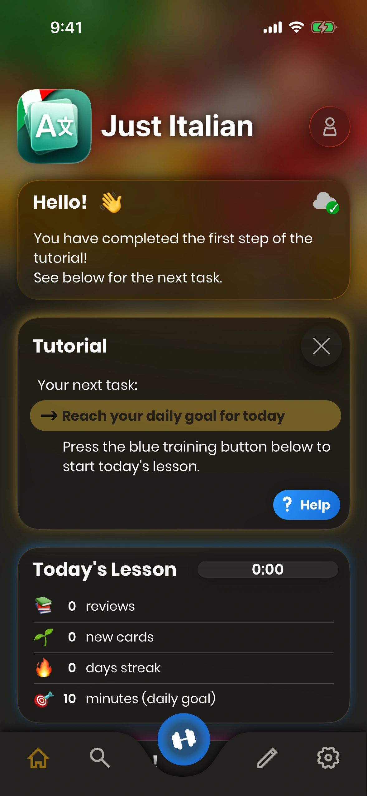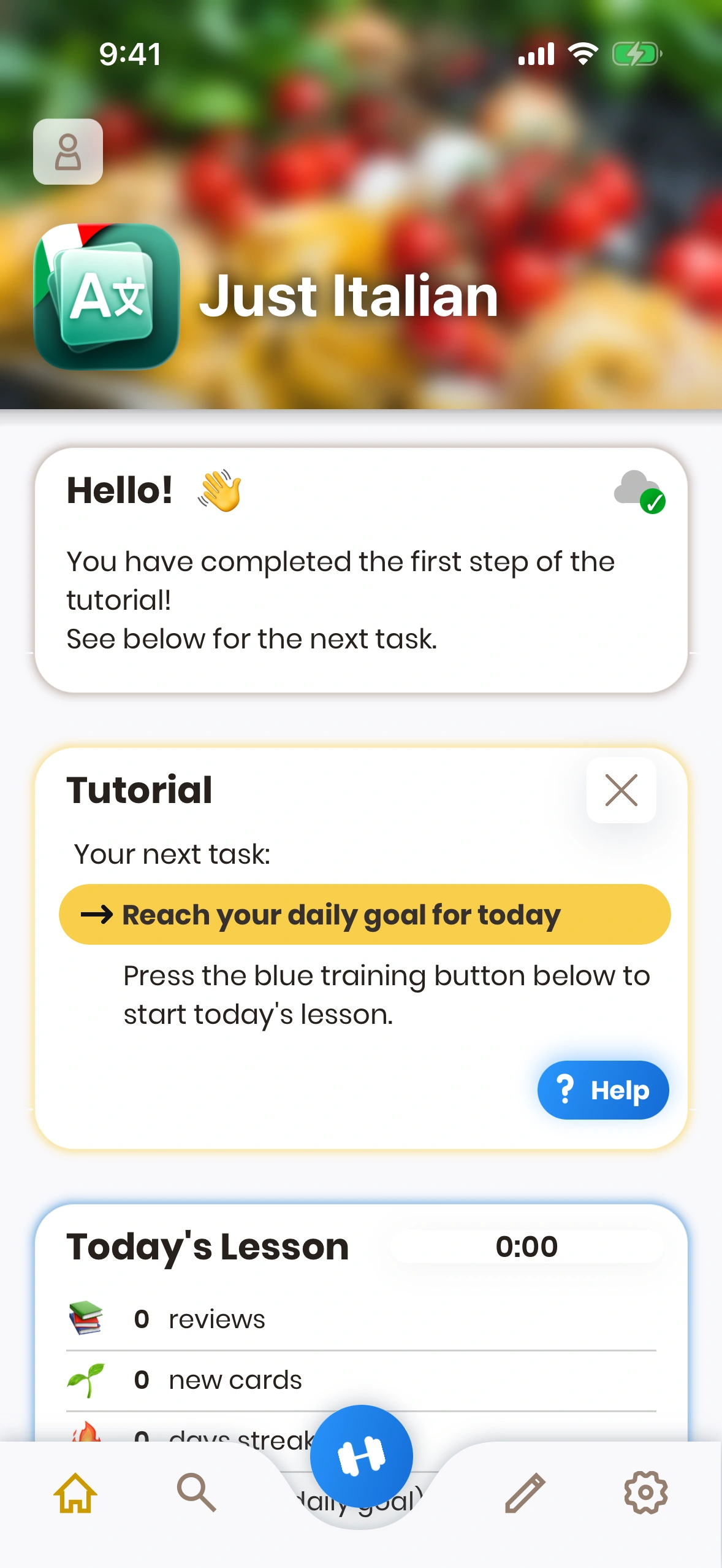 After you have completed the tutorial that lets you make the first steps through the app, Just Italian presents a few tasks to you. Each of these tasks guides you through a specific function of the app.