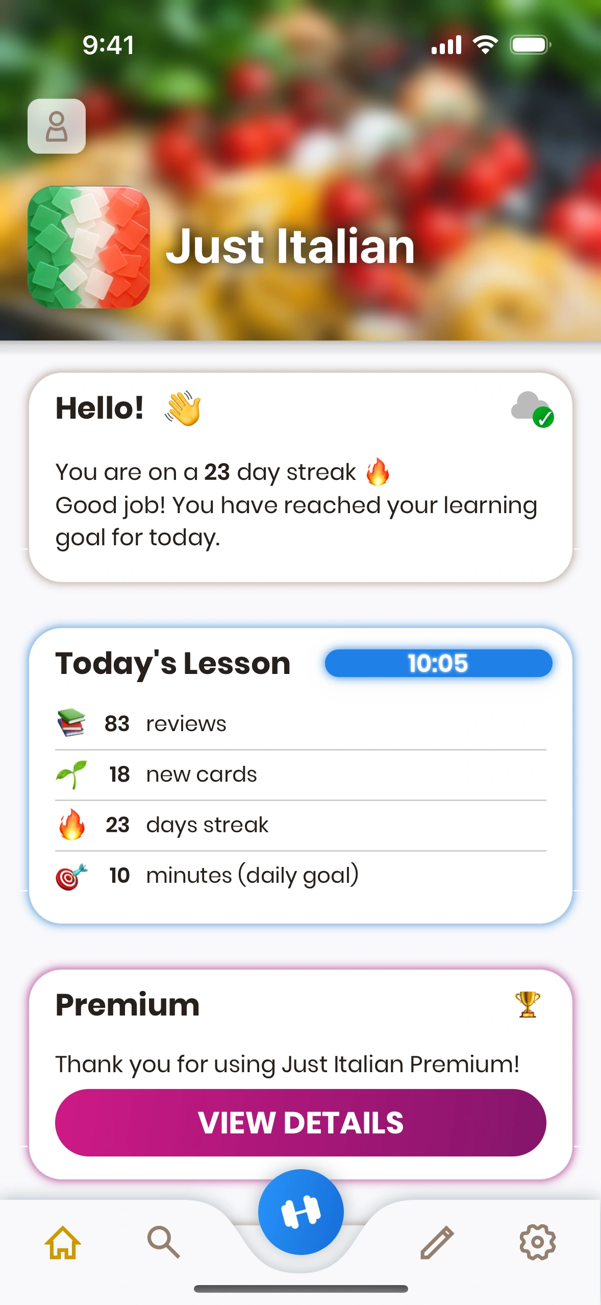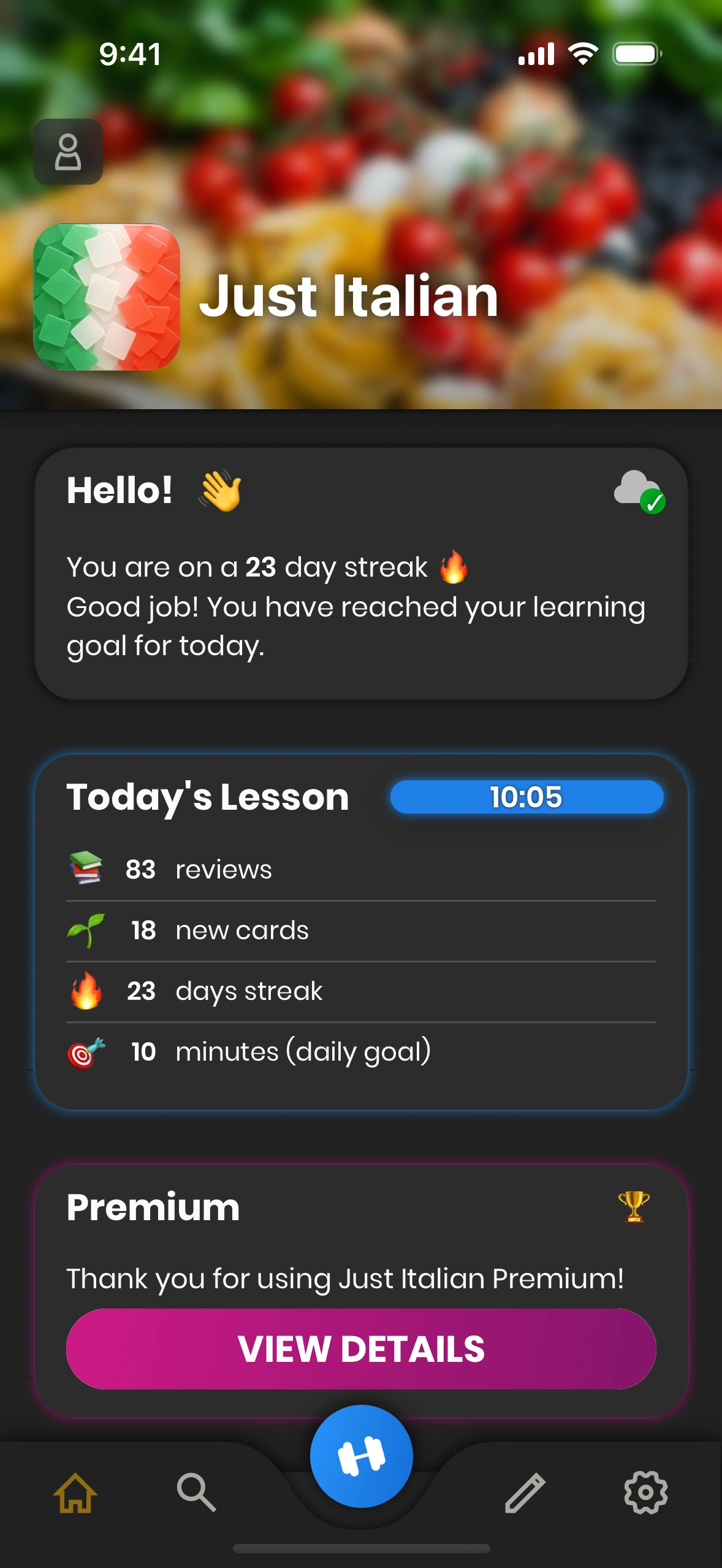 A learning session can be started by tapping the round Training Button at the bottom of the app.