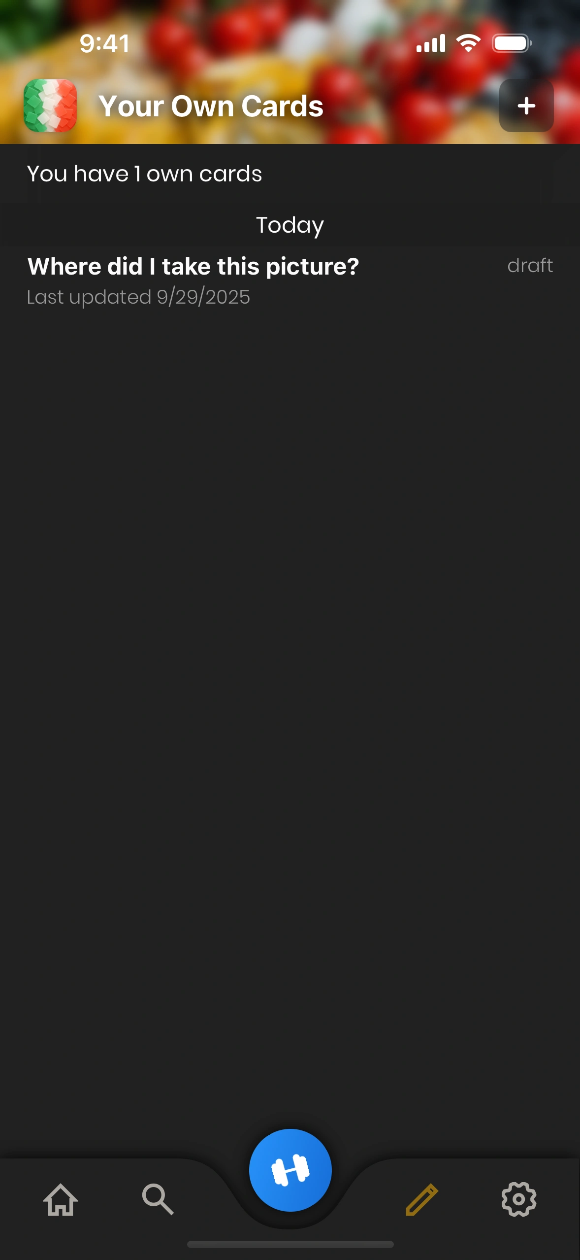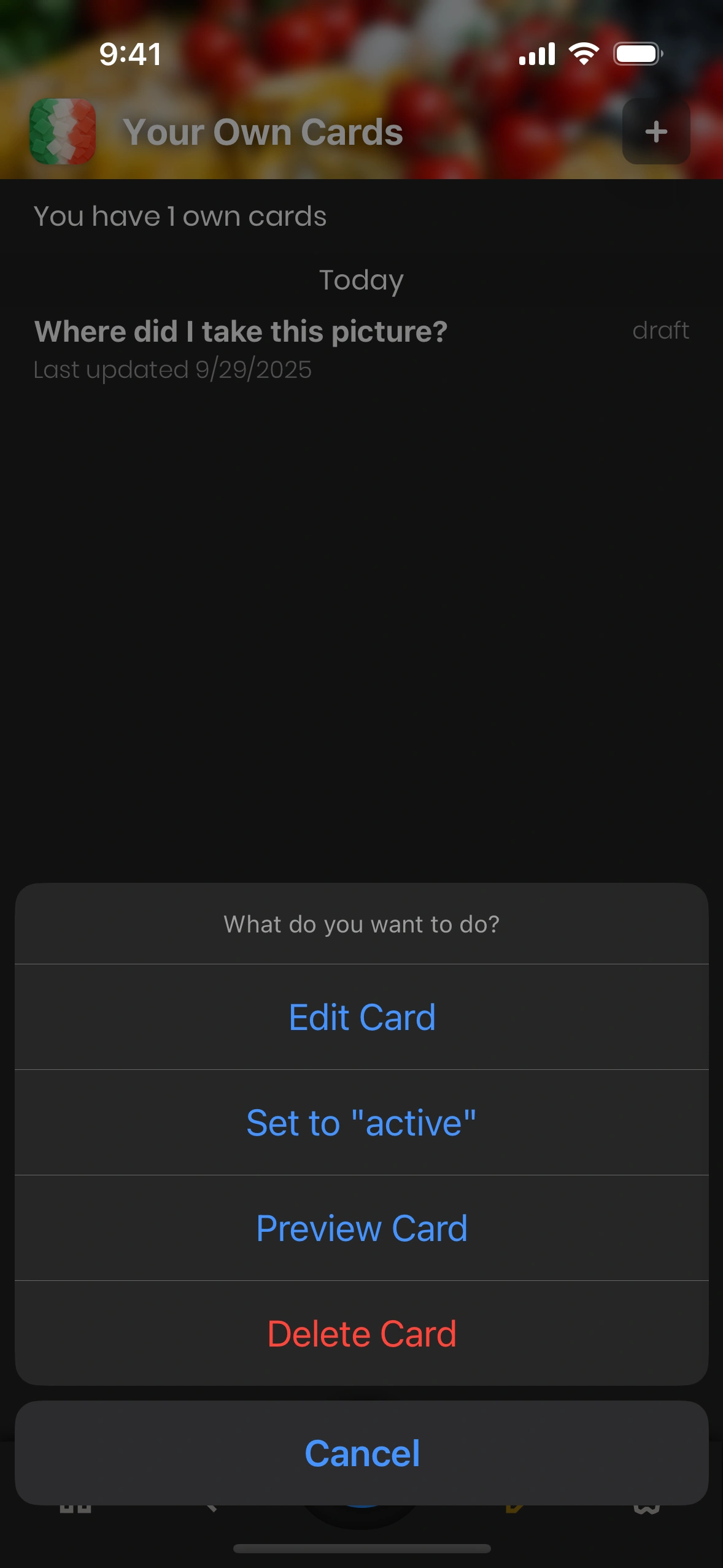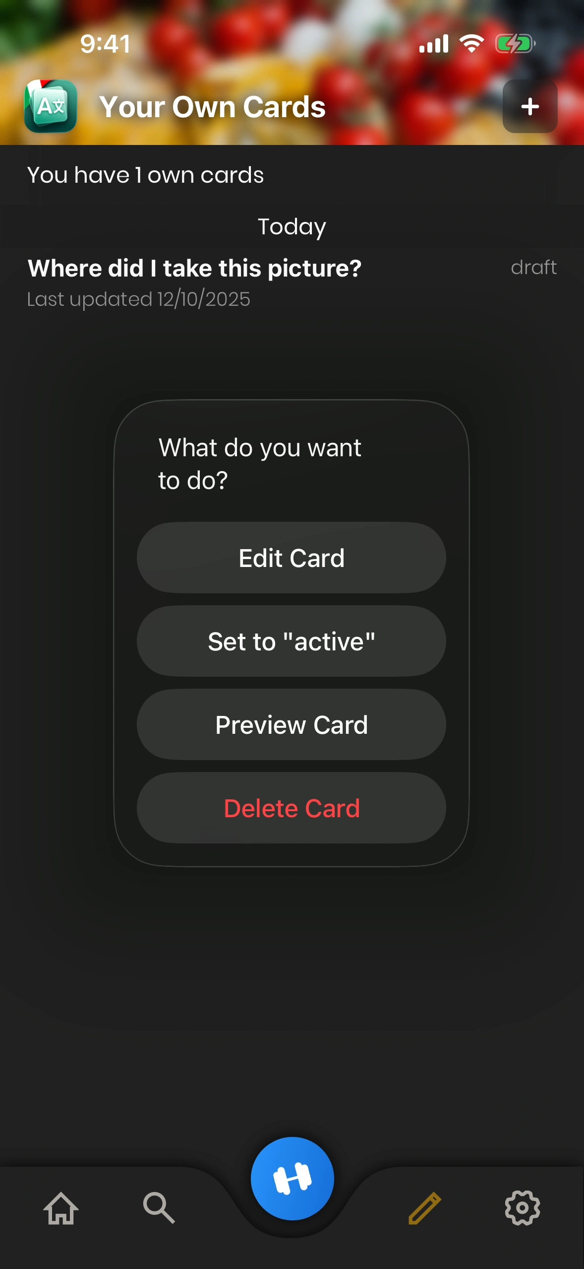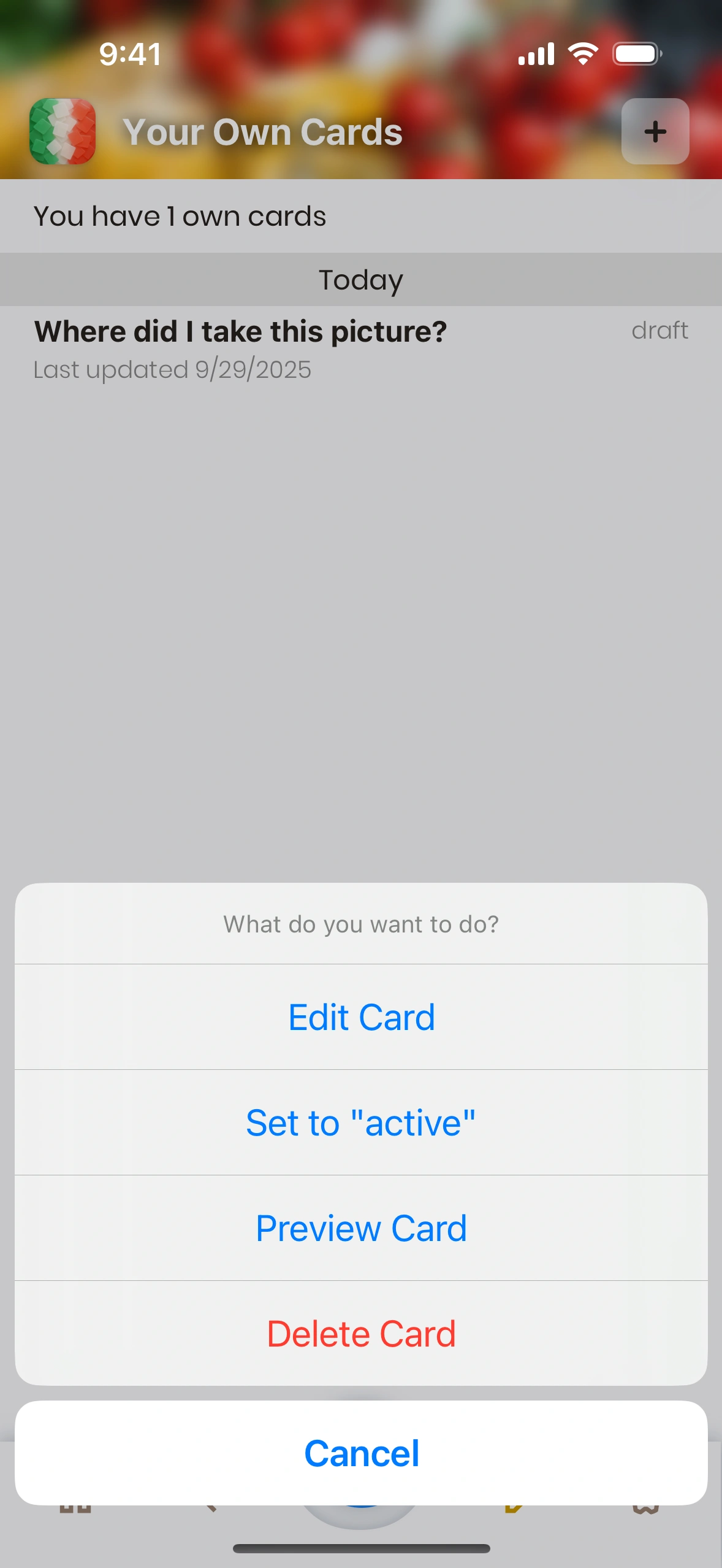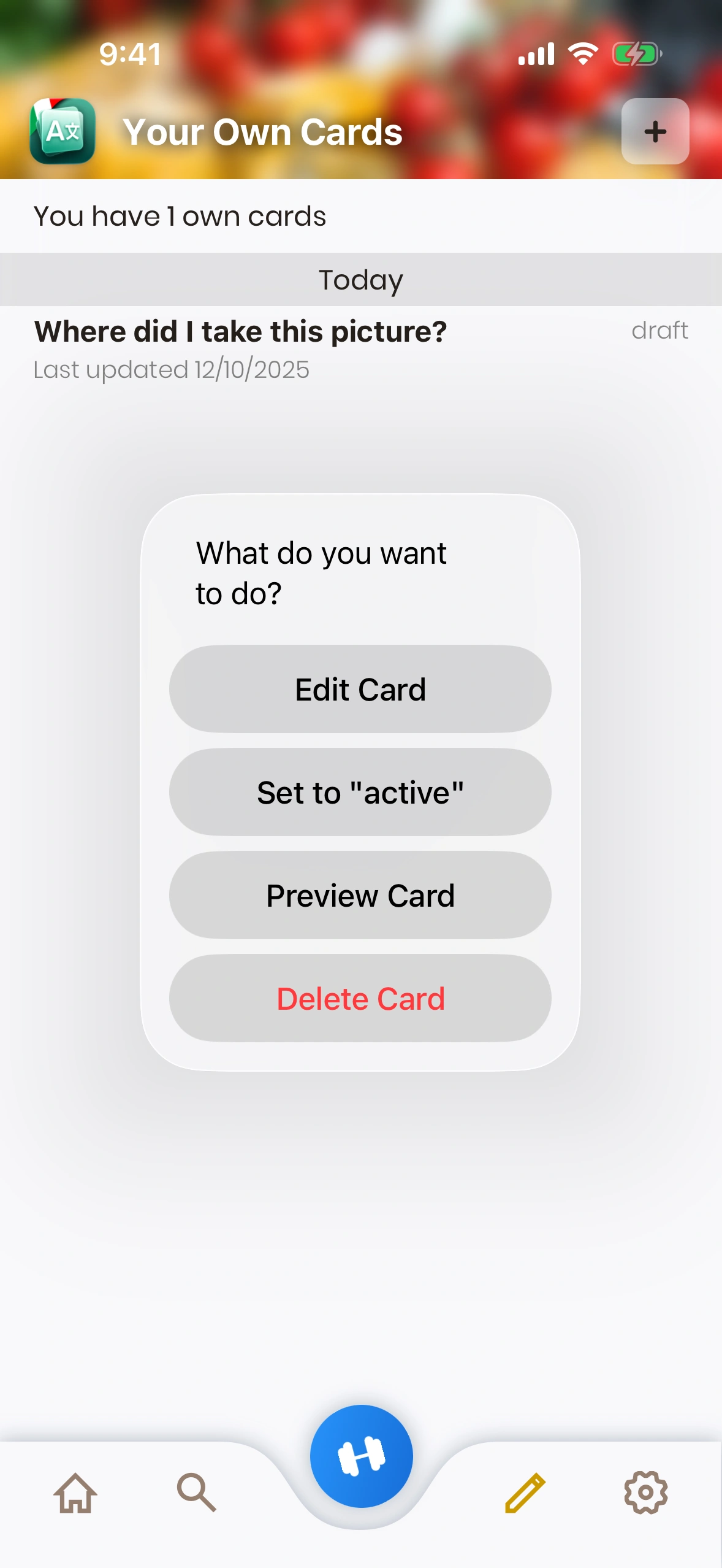 - Card Status: An Own Card is either in "draft" mode or "active". Draft cards are not shown while learning. To change the status of a card, tap it.