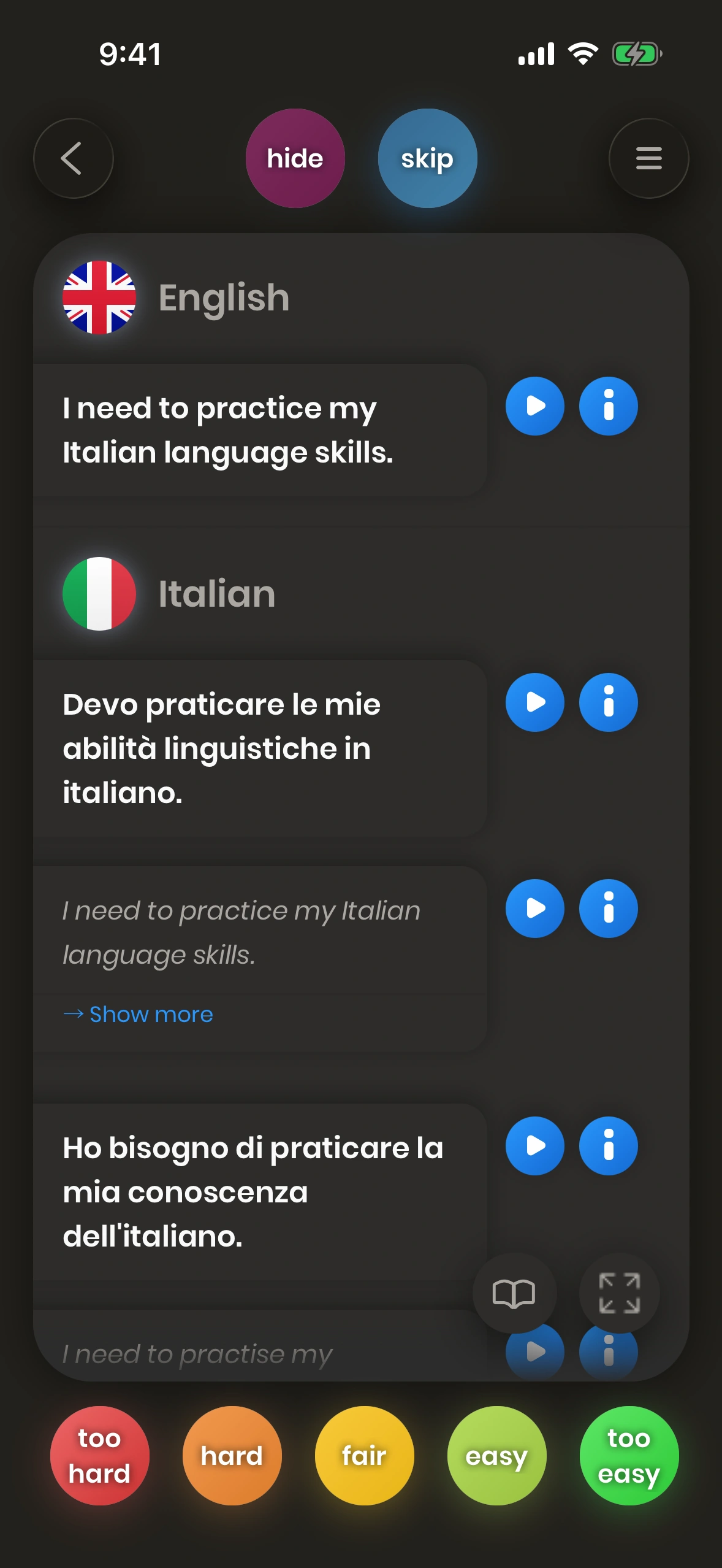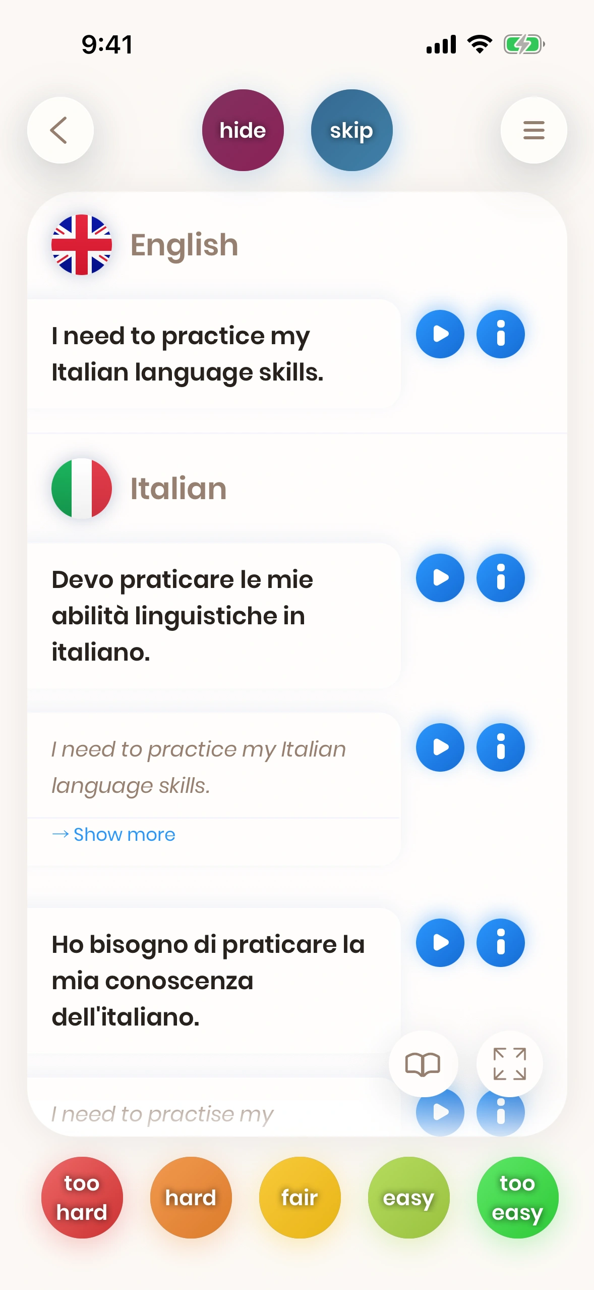 Look at a card. Try to translate the word or phrase. Turn the card. Tell us how difficult it was. Difficult words and phrases are shown again soon.